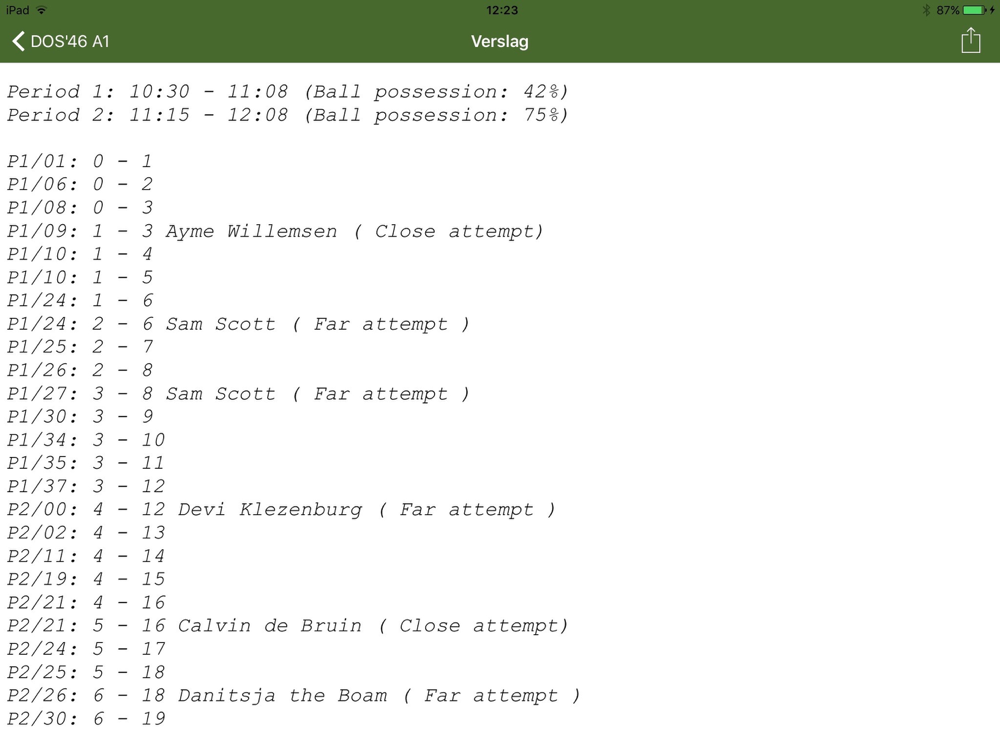Afterwards (or during) a match, you can let the app make a report of the match. The report includes the statistics of the match, plus the scoring timeline (including the players who scored), the substitutes, the percentage of ball-possession, and for every defined actions the statistical data.