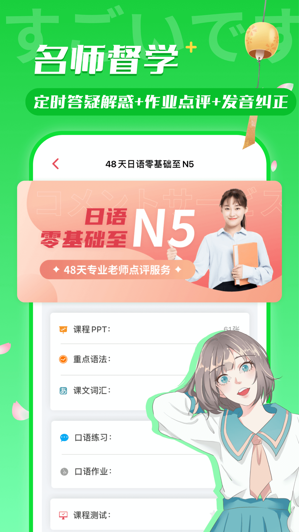 48天零基础至N5,等级考试课程,课后服务,跟着真人老师学日语 。