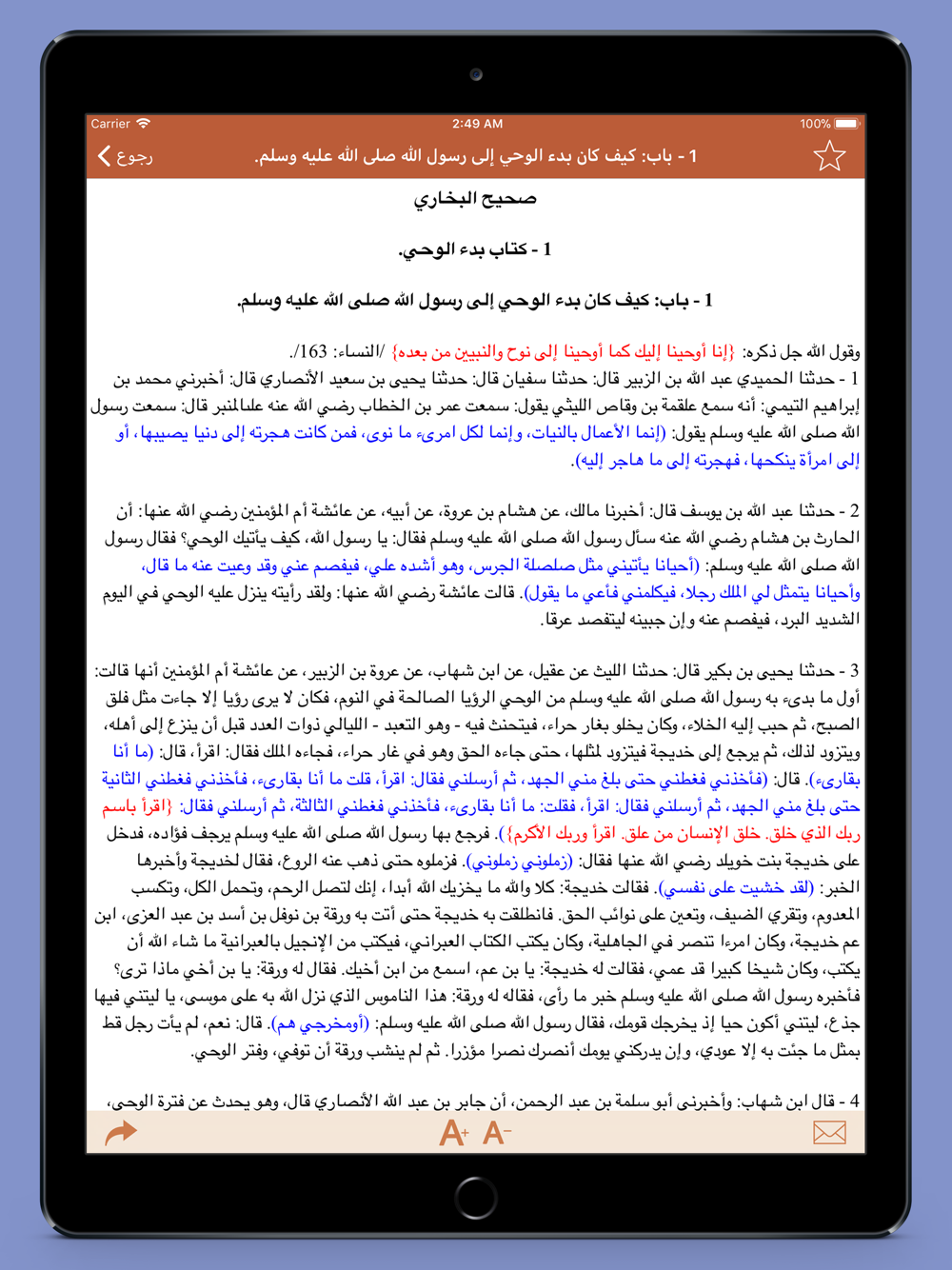 نصوص الأحاديث و الشرح مكتوبة بخط واضح مع تلوين للآيات و الأحاديث، و إمكانية تغيير حجم الخط حسب الرغبة.