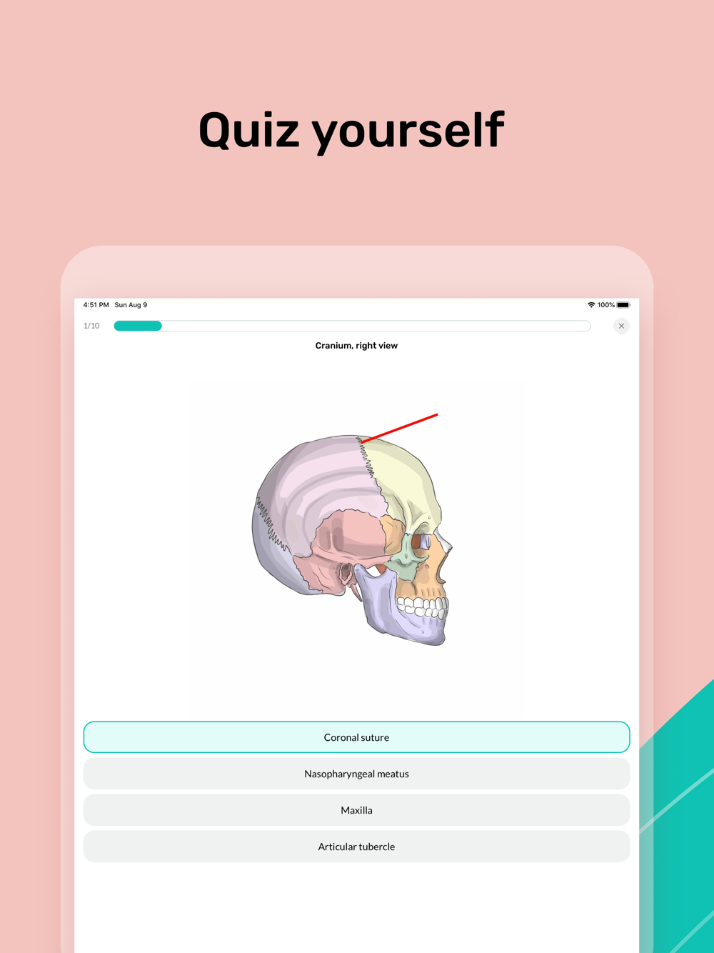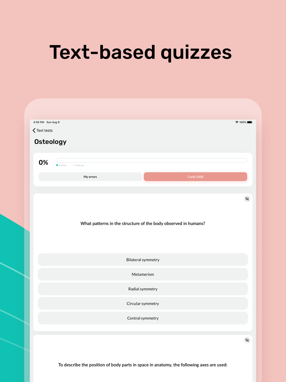In the app you will find an anatomical atlas with more than 10 000 flashcards, anatomical articles, and quizzes for more efficient memorization of anatomical structures.