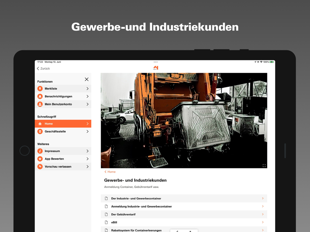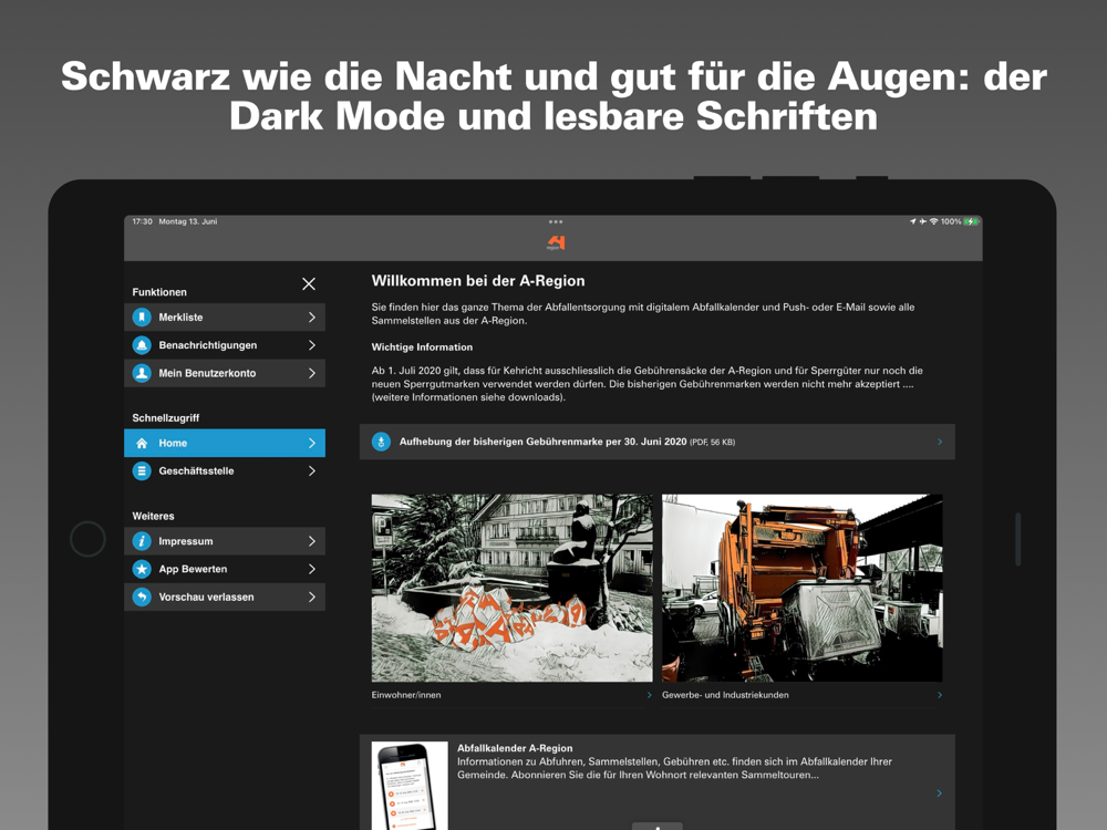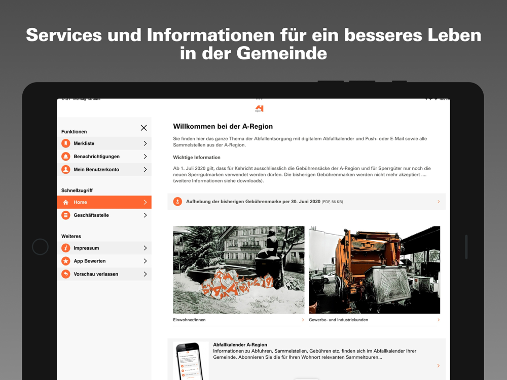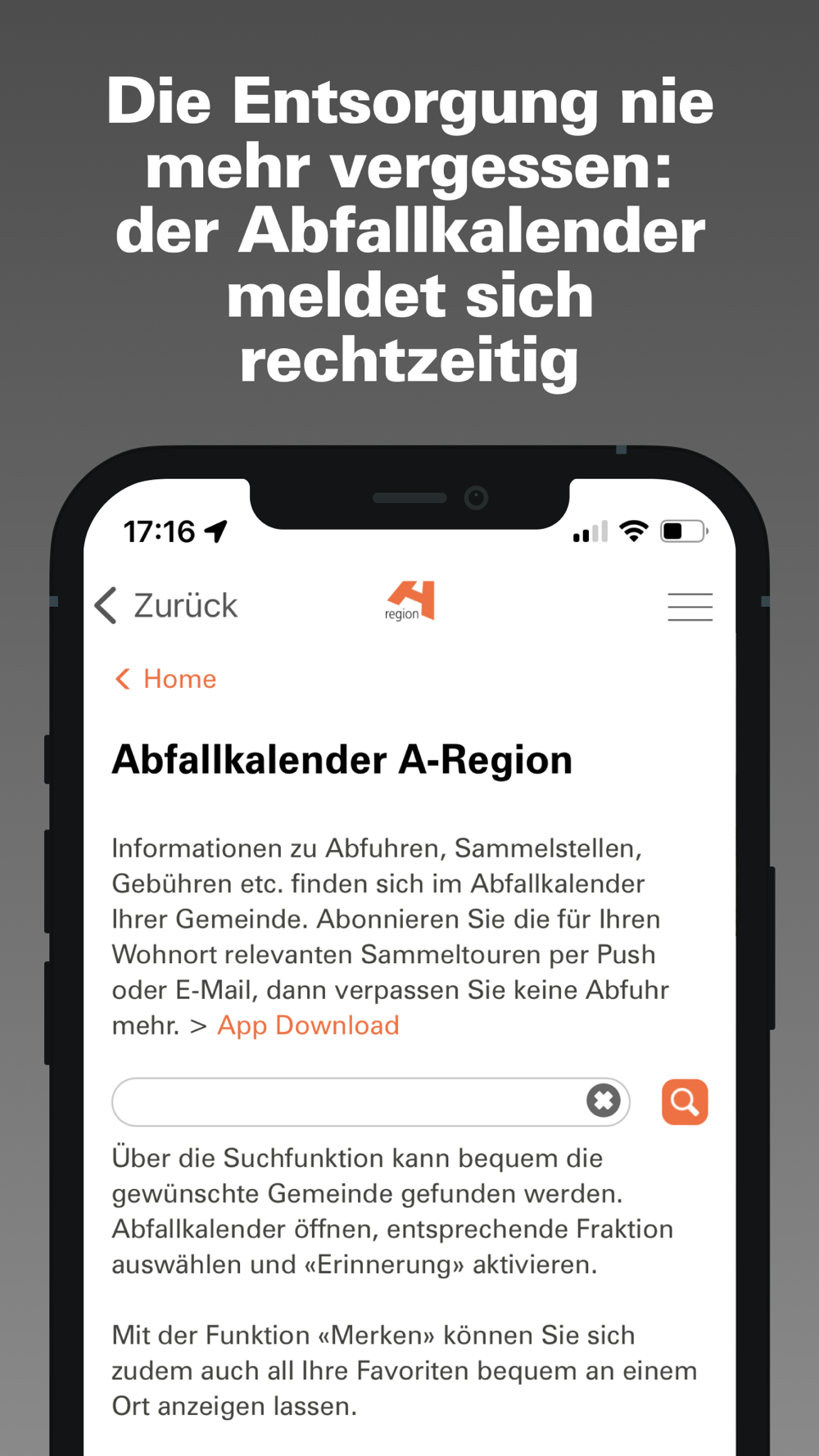 In der «A-Region-App» ist ein digitaler Abfallkalender der Abfallregion St. Gallen-Rorschach-Appenzell mit Push- und E-Mailfunktion aufgeschaltet. Damit verpassen Sie keine Sammeltouren mehr. Auch Sammelstellen für Ihre Wertstoffe lassen sich ohne Probleme via Karte finden.