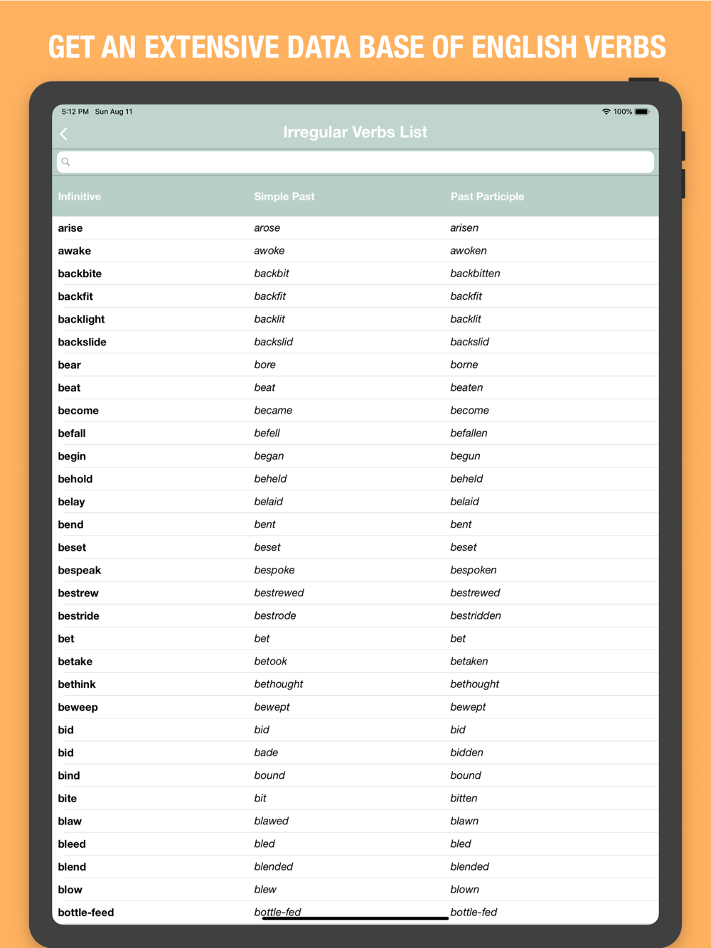 - An App custom designed for English verbs, tailored for the particular difficulties of the English languages: Irregular Verbs