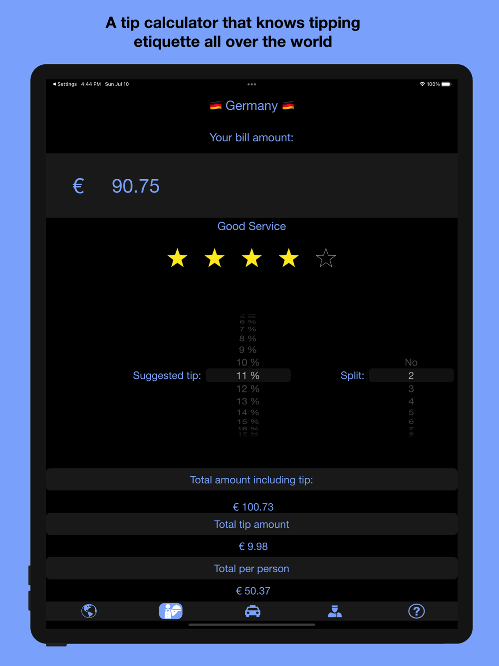 Having dinner in Paris, a taxi in Moscow, or a bellhop carrying your bags in Sao Paulo? This app knows and calculates how much you should tip in each situation in any country!