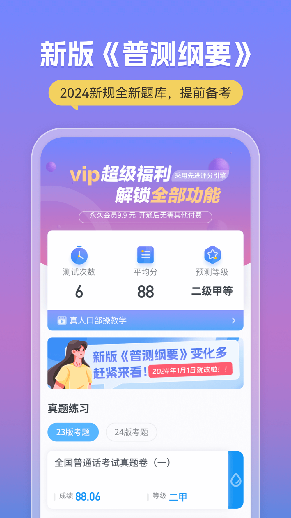 普通话考试,普通话学习与测试的随身软件,汇集普通话考试真题题库,适用于普通话考生、教师、播音主持、配音员等人群,学拼音、发音,纠口音,助力您的普通话学习!
