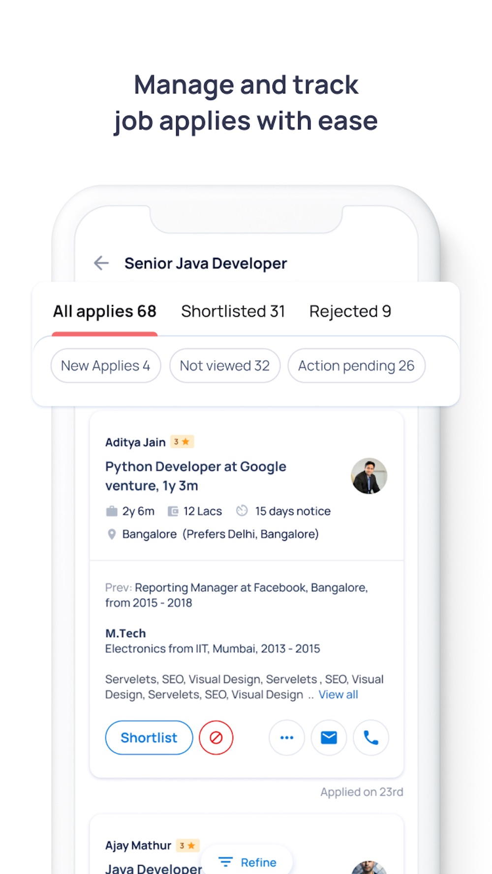3. Continue right from where you left - Now you can carry on right from where you left your desktop. Naukri also offers a personalized experience tailored to your specific needs. You can easily check the status of your job applications, conduct a search, see which candidates have been called (call picked up/not picked up) and more – all in real time from the convenience of your mobile device.