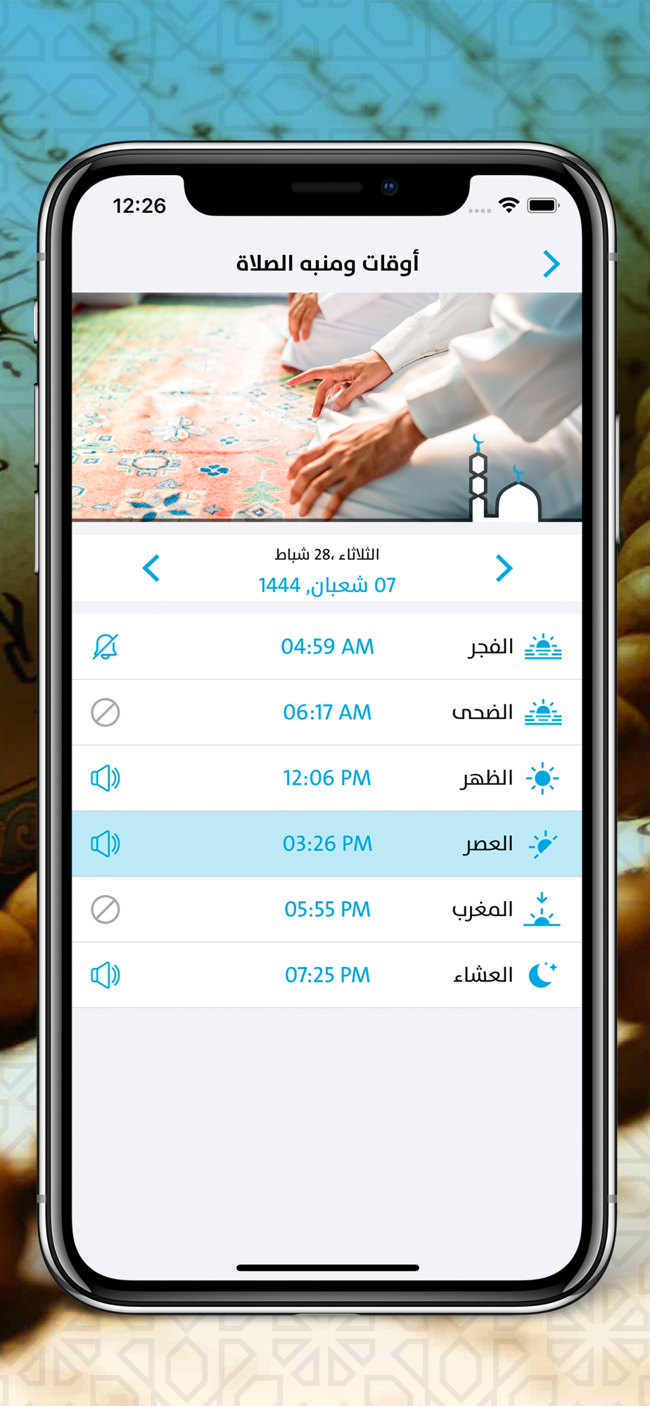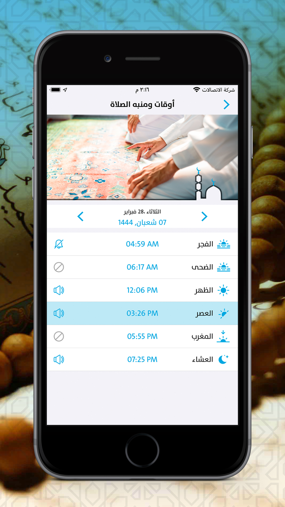 - تنبيهات خاصة بالصلوات يمكنك ضبطها او الغائها لكل صلاة على حدة وهي: تنبيه بالاذان و تنبيه قبل الآذان .