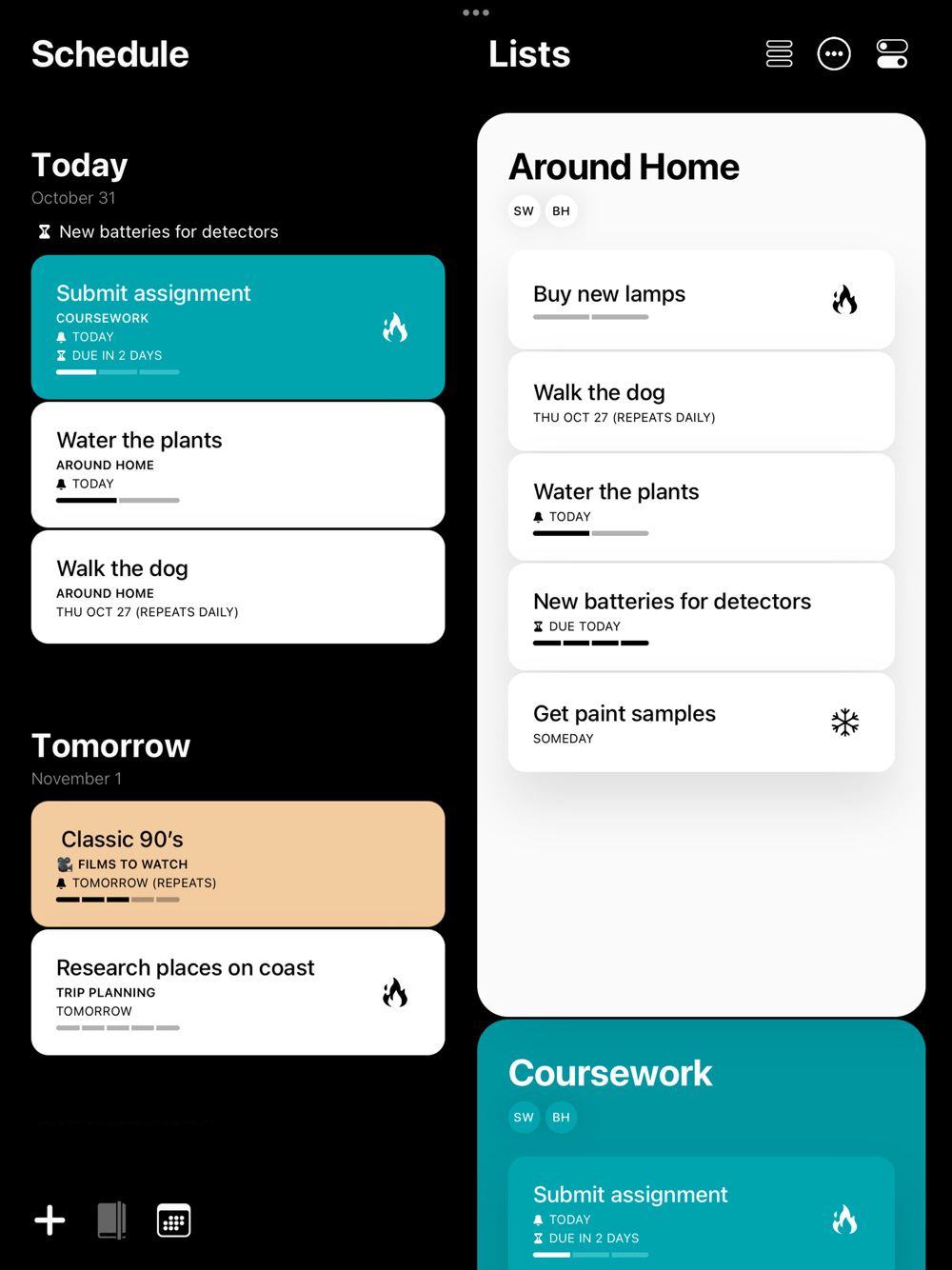 Collect your thoughts in a calm interface with simple natural language like “Water the plants every Saturday” then let Actions take care of reminding you automatically.