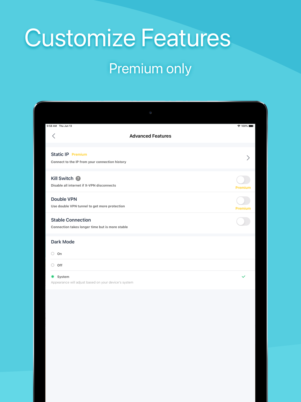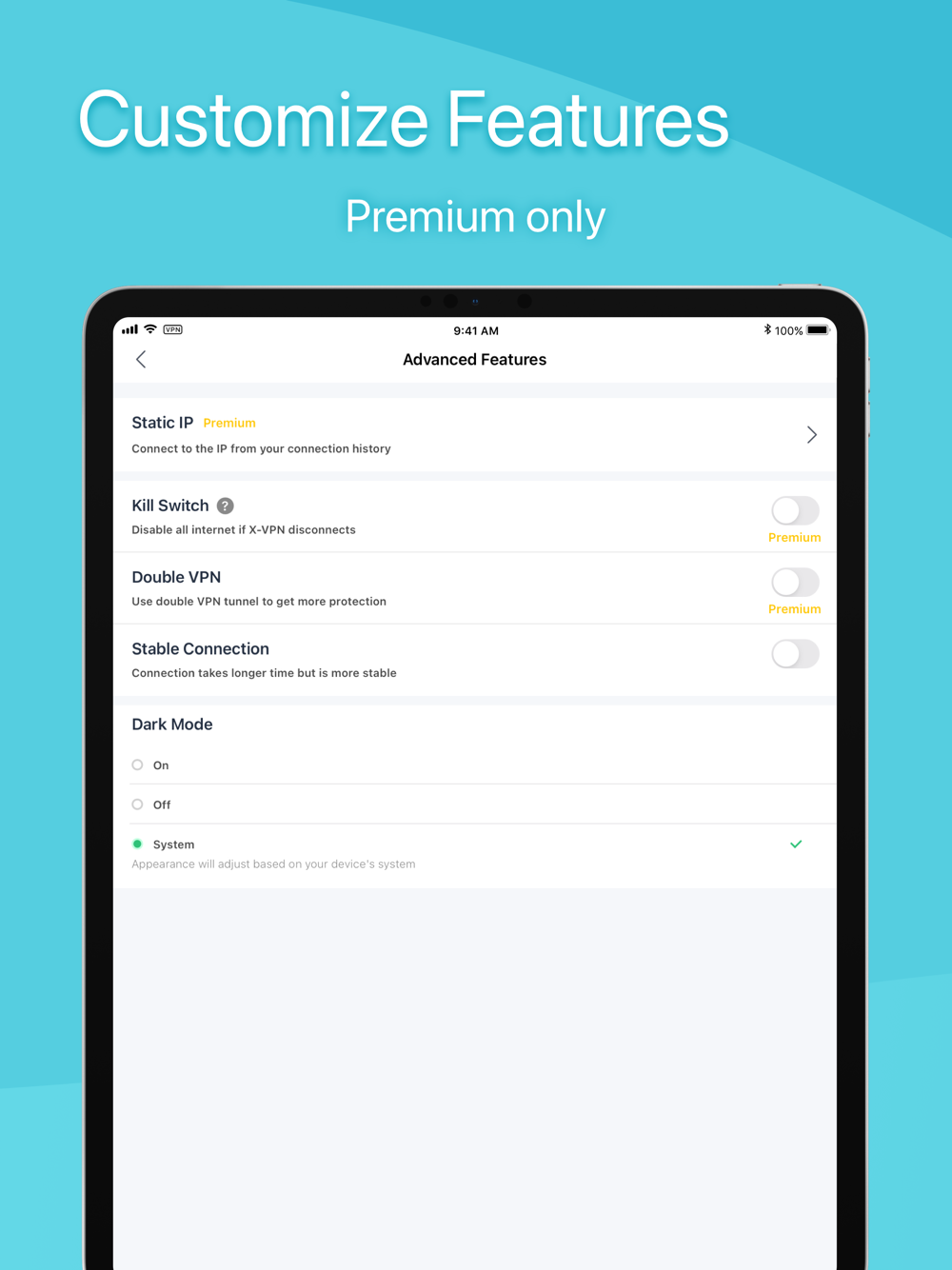 We provide several functional security tools for all users including Kill Switch(premium only). With Kill Switch on, all internet will be disabled if X-VPN disconnects.
