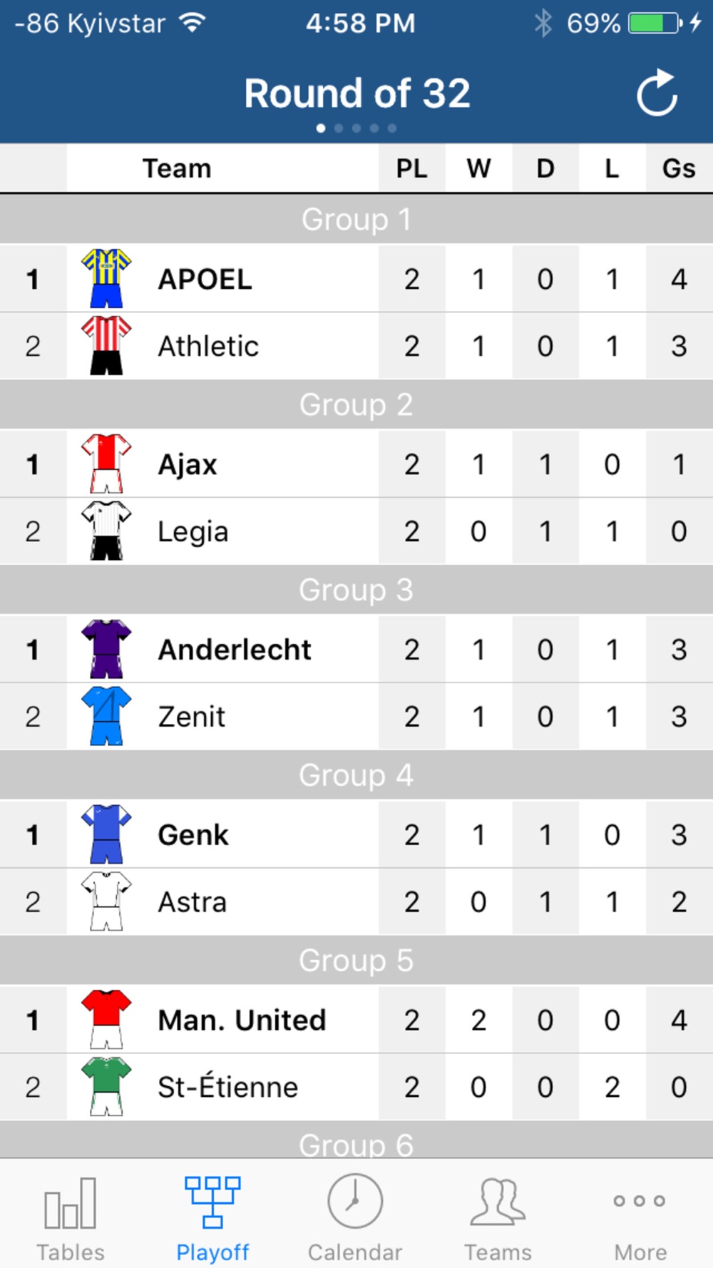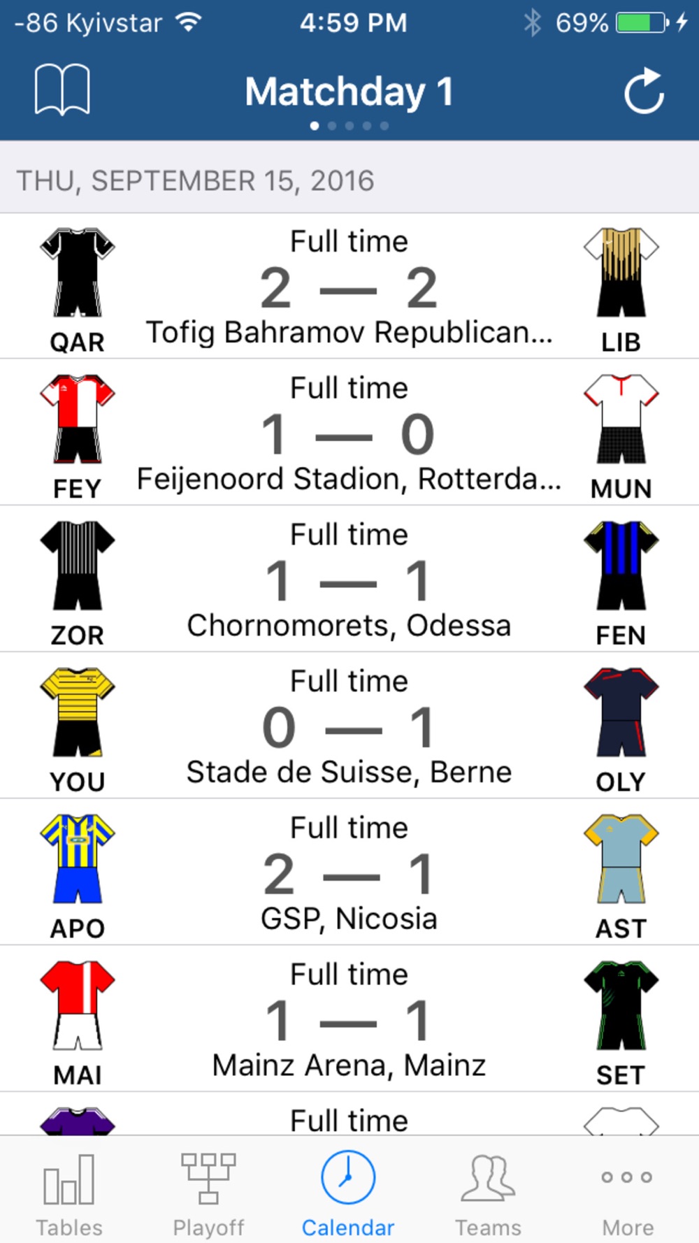 Using "EUROPA Football - 2017-2018" you also get immediate access to the Tournament table, Schedule, Teams, Events in Matches, News and Statistics.