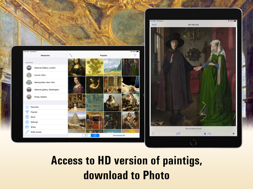There is no need to download different applications for each museum independently, because all of them have already been gathered in one app! Within few clicks you have access to any picture you like in HD quality. The HD pictures` resolution on the average is starting from 1548*4226 to 7689*4215 pixels depending on the original picture size.