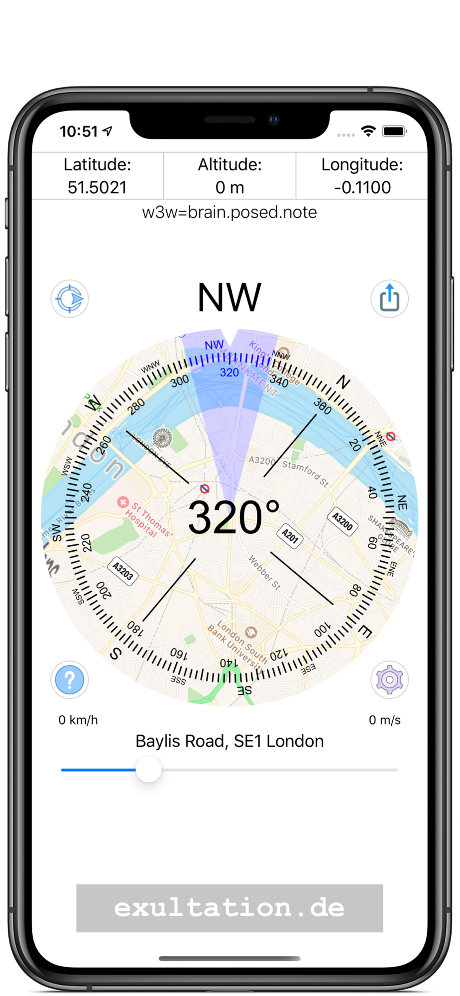 In addition, the position is displayed in What3Words (w3w) coordinates.
