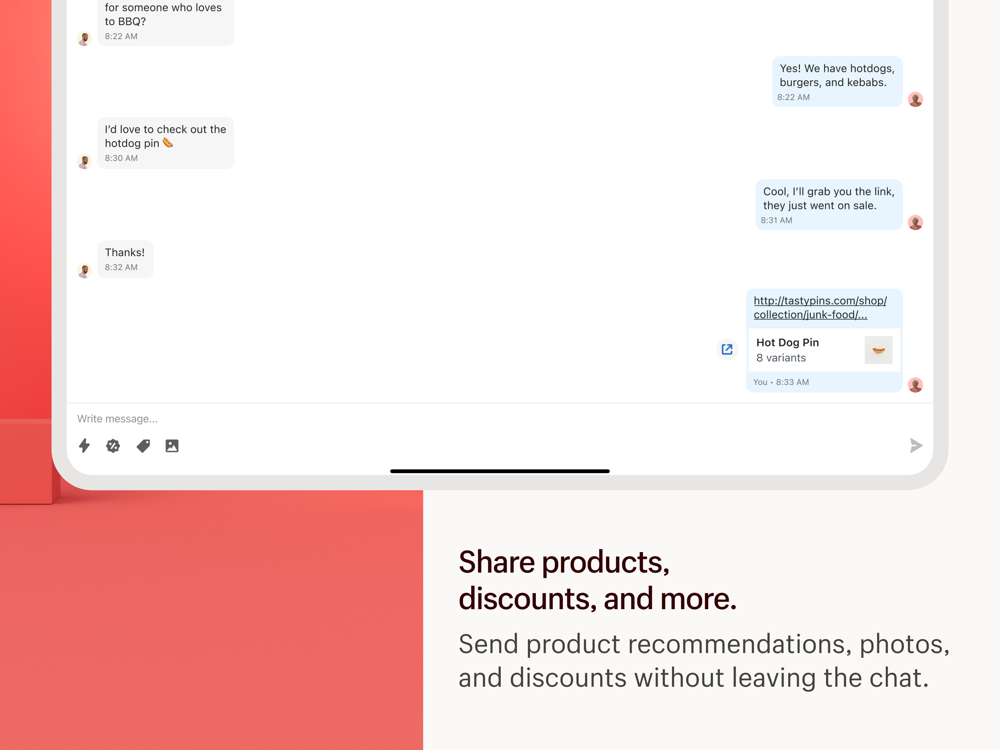 • Send products, discounts, and new orders from your Shopify store directly inside chats with just a few taps to turn more conversations into checkouts
