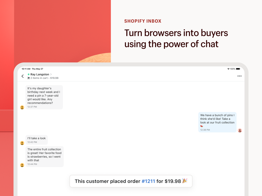 Use Shopify Inbox to talk with customers and sell over chat. With Shopify Inbox, you can close sales faster, build strong customer relationships, and spend less time on support all from a free business chat app.