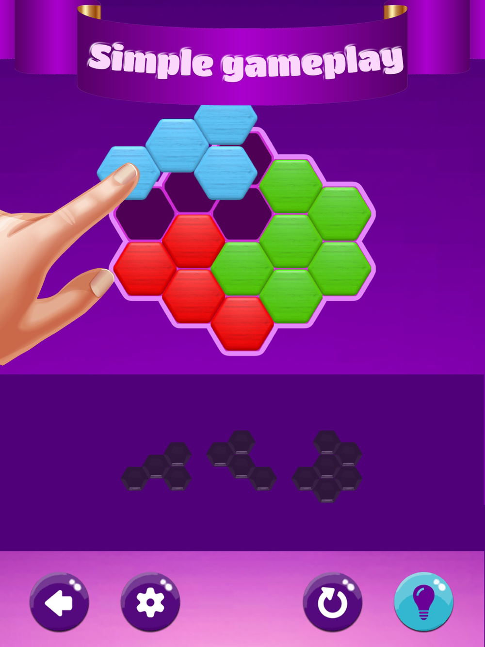 Just drag and drop all the Hexa Blocks on the board. The rule is simple: everything must fit!