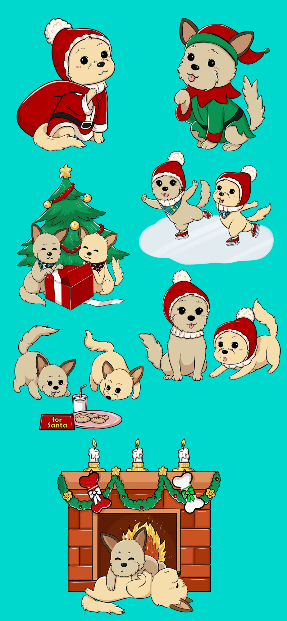A collection of cute stickers from The Woof Warehouse, featuring Watson & Sherlock wearing some nifty accessories, napping in our burrow beds and getting cozy under our convertible blanket pillows.