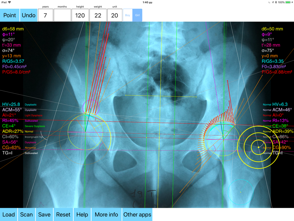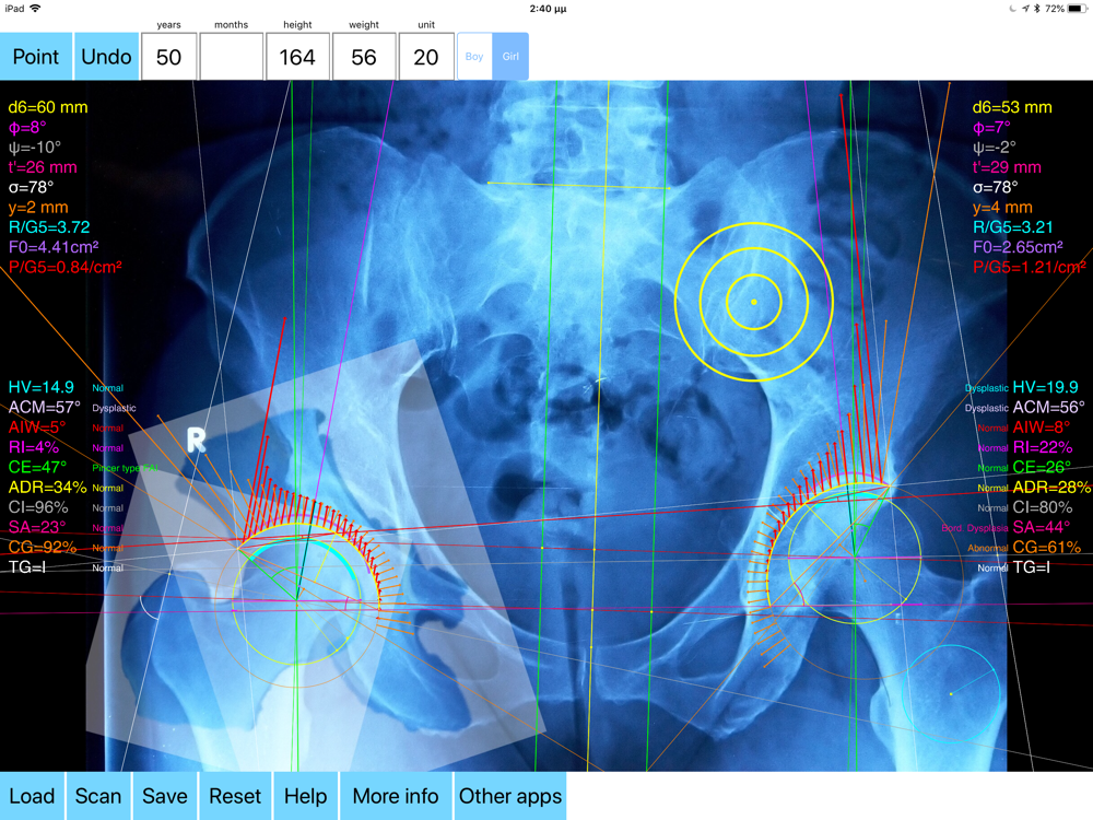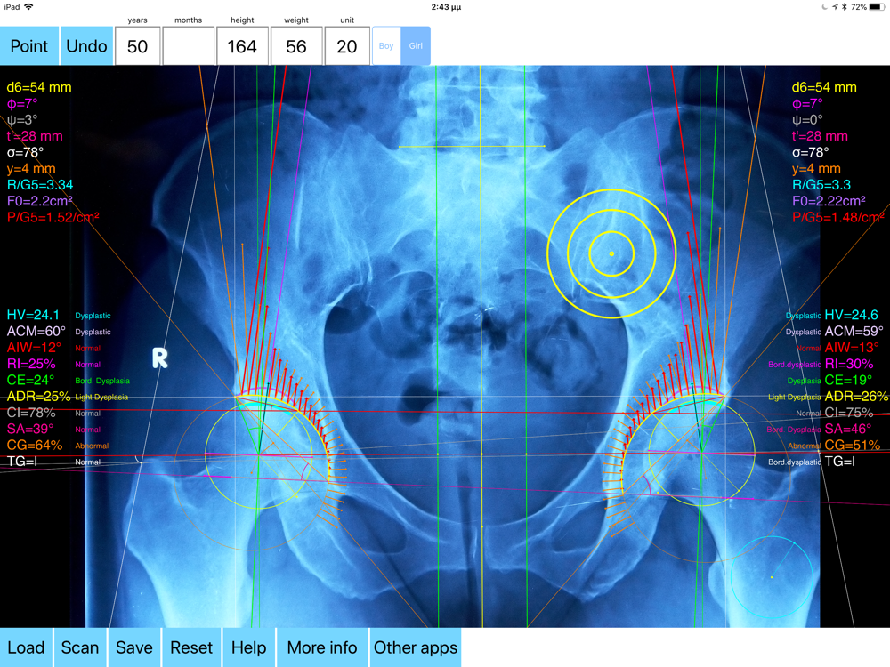 -Offers a very convenient way to determine the most accurate possibly way eleven Indexes of hip dysplasia at once. By inserting the gender the age and marking certain anatomical landmarks -points at the same X-ray, at each hip, the App calculates the eleven above mentioned indexes (AI, AIWB, CE, RI, ADR ,CI, SA,TG, CG,HV,ACM) without to have to repeat each measurement separately. You measure all radiographic Indexes in one picture. Gender age and side-specific normal reference databases are used and in cases where values are out of normal ranges, the hips are categorized according the measured Index normal categorization.