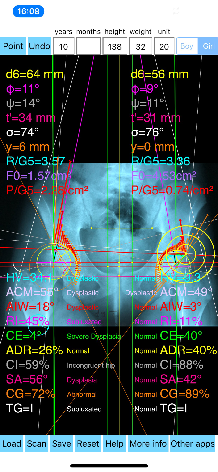 Simply by marking certain anatomical landmarks at each hip you measure in an instant, all these indexes ,and biomechanical status of the joint is calculated. The app also compares the results with normal age, gender and side specific reference databases retrieved from the international literature.