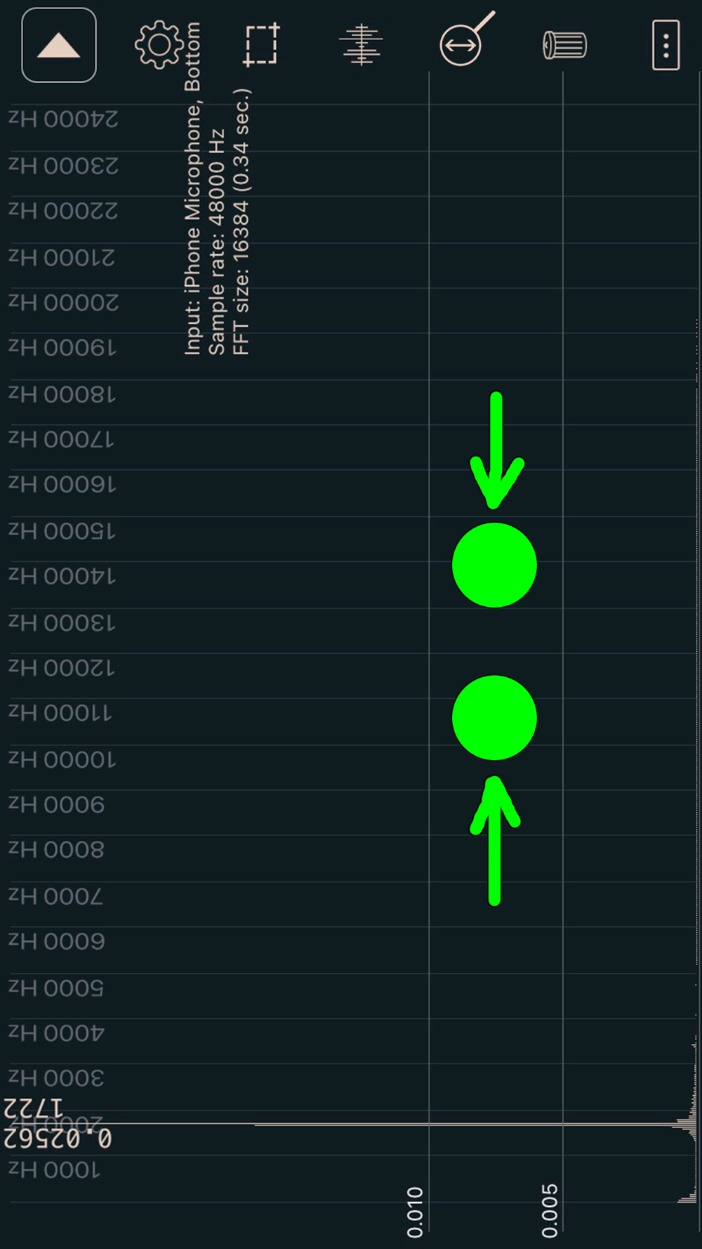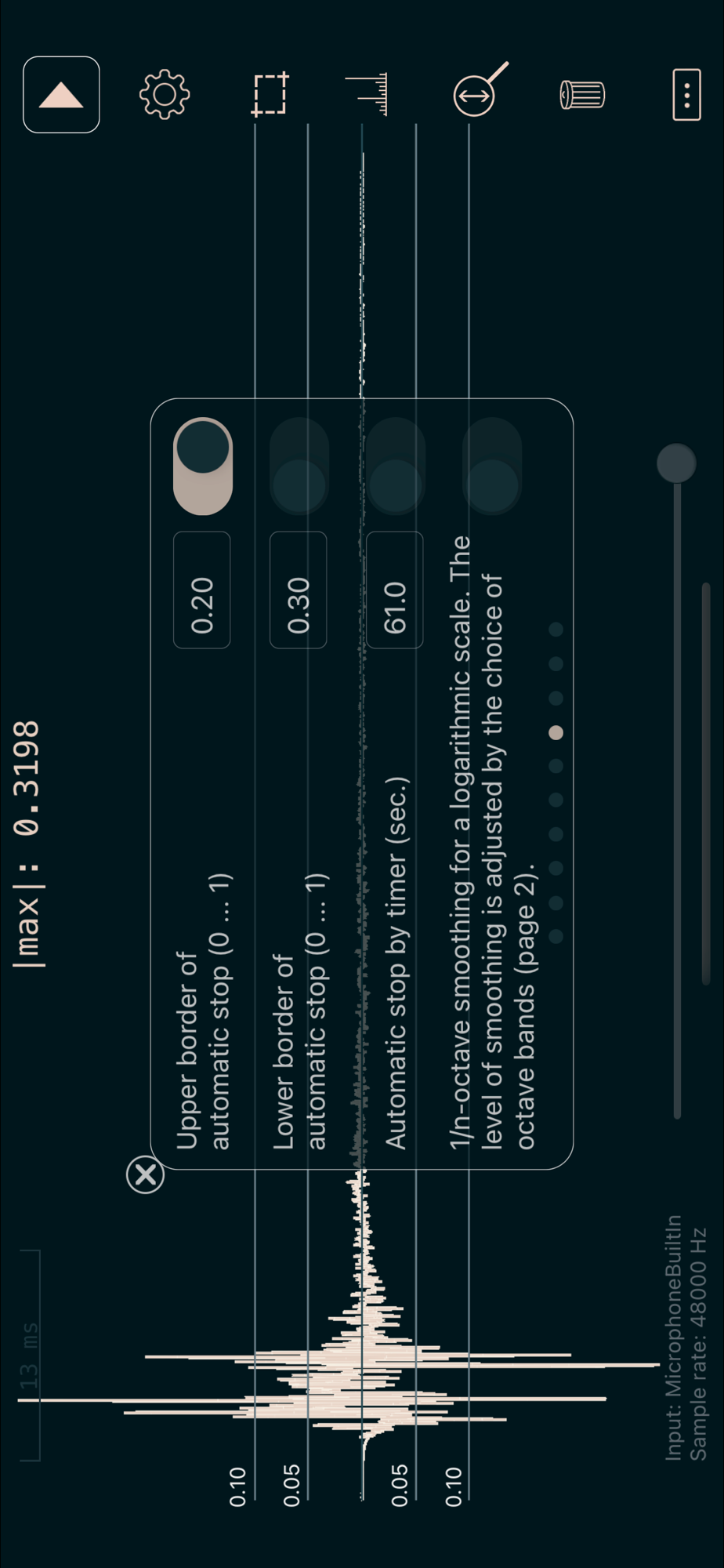 • Sound level meter (dB SPL). You can calibrate your microphone by launching a signal generator with a sinusoid frequency of 1000 Hz on another device and making the volume very low. When the sound is almost inaudible, it is necessary to find the amplitude for the frequency of 1000 Hz on the spectrum (FFT size: 16384). This value should be multiplied by 1.2 (to compensate for spectral leakage). It will be the reference value for your microphone. ESTIMATE THE TOTAL NOISE LEVEL BY USING THE SOUND WAVE MODE AT THE MAXIMUM VALUE.
