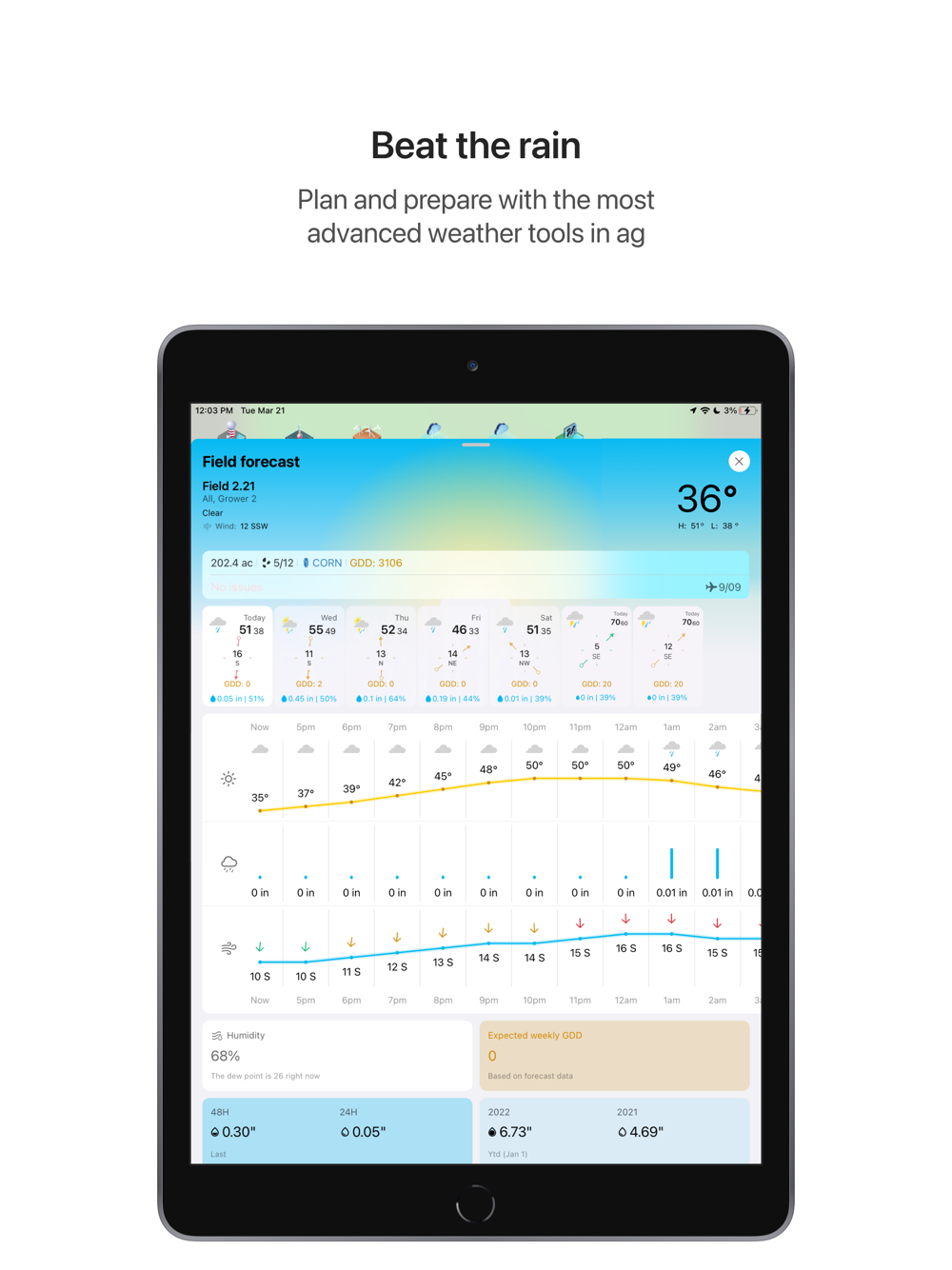 Track weather including last 24-hr precipitation, active radar, wind speed, temperature, and GDDs. Efficiently sort fields by a variety of weather patterns to make field work scheduling a breeze. AGMRI also allows you to see weather patterns as they move over your region so you can plan ahead or quickly take action after a sporadic weather event.