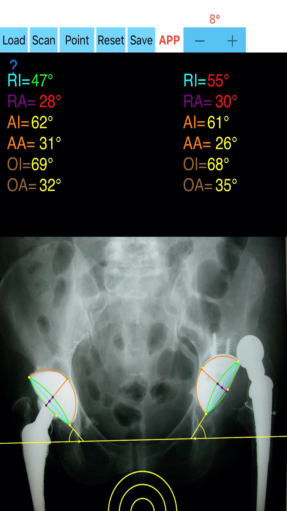 -By marking certain anatomical landmark and points in a simple standard AP pelvic radiograph, values for cup inclination and anteversion are being calculated. The app is based on Widmer’s method which is the proven that is the most accurate compared to others.