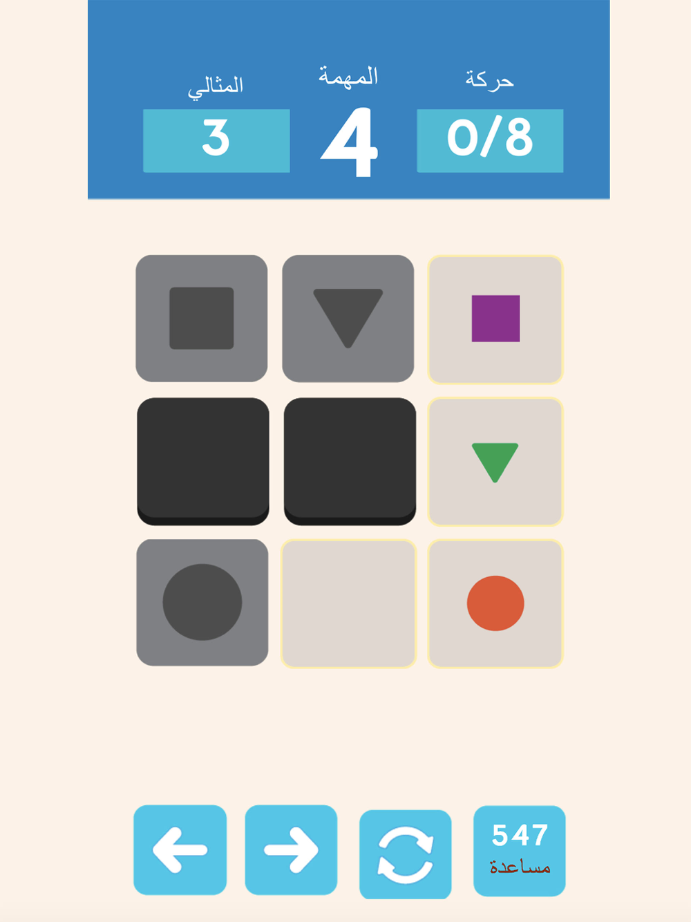 لعبة عصف ذهني والالغار عربية مجانا ،عليك تحريك الاشكال ومطابقتها في المربعات الملونة ،العب مئات الألغاز المجانية.