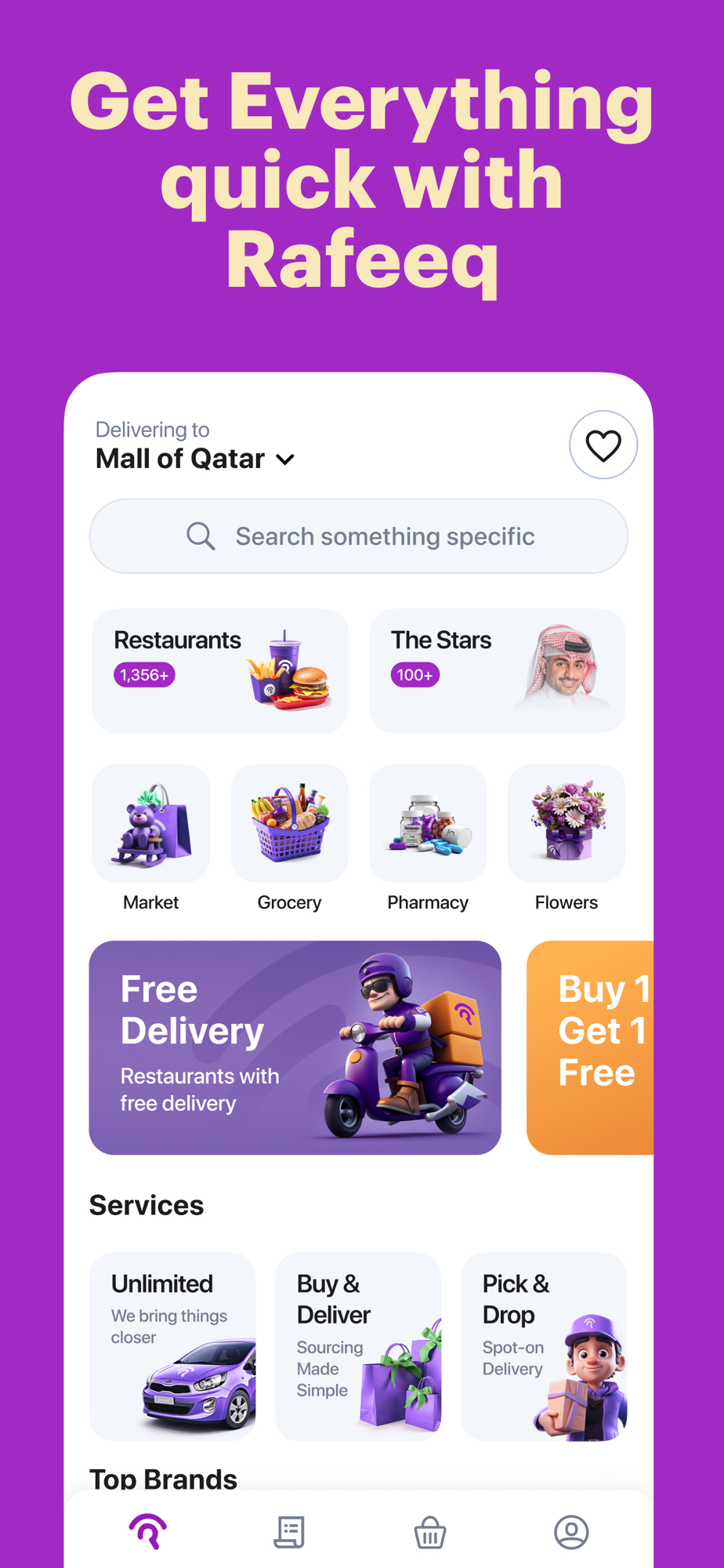 Welcome to Qatar's number one super app, Rafeeq – your ultimate gateway to seamless living in the heart of the Arabian Gulf. From food delivery that tantalizes your taste buds to a comprehensive range of groceries that fills your pantry with the finest, we've got it all covered. Our online shopping experience is designed to bring the mall to your doorstep, with an array of shops, including flower shops, pharmacies, clothing boutiques, beauty stores, and so much more.