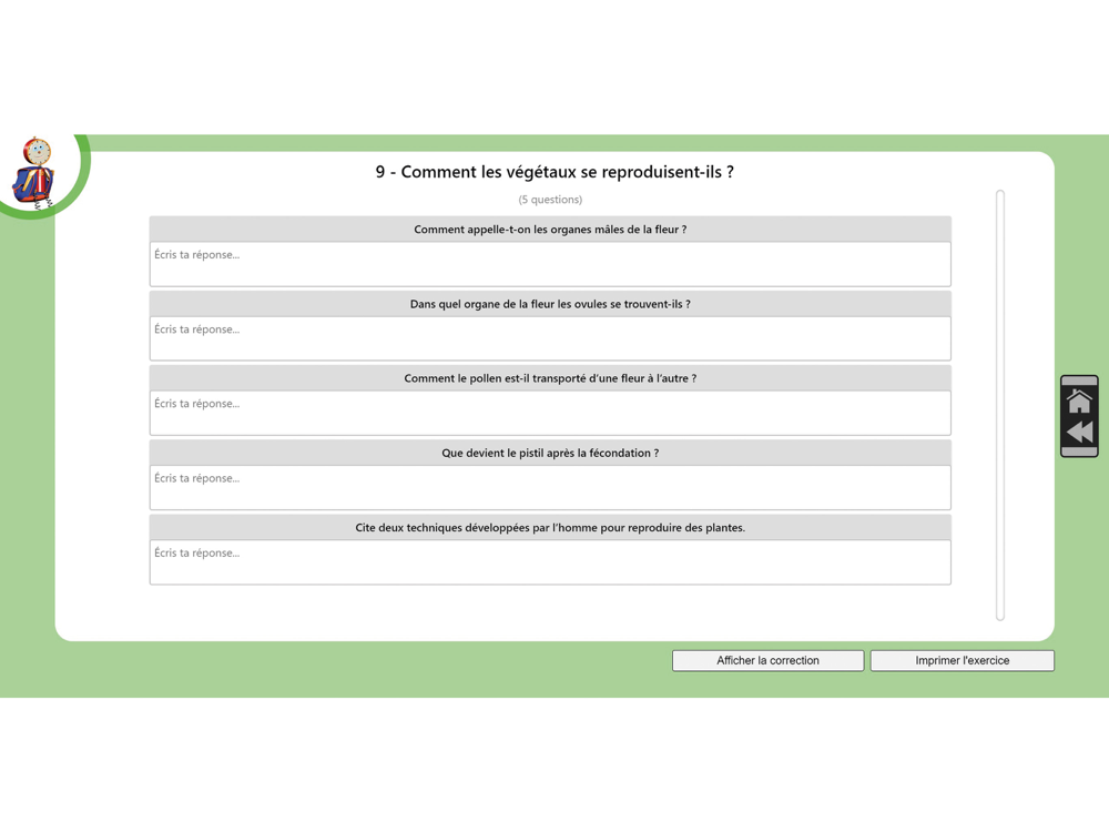 Chapitre 2 - Le vivant, sa diversité et les fonctions qui le caractérisent : 1. Qu’est-ce qu’un être vivant ? – 2. Comment la vie est-elle apparue sur Terre ? – 3. Où vivent les êtres vivants ? – 4. Comment les êtres vivants s’adaptent-ils à leur environnement ? – 5. Comment classe-t-on les êtres vivants ? – 6.Comment les animaux se développent-ils ? – 7. Comment les animaux se reproduisent-ils ? – 8. Comment les végétaux se développent-ils ? – 9. Comment les végétaux se reproduisent-ils ? – 10. Quels sont les besoins alimentaires des animaux ? – 11. Comment le comportement alimentaire de certains animaux change-t-il en hiver ? – 12. Quels sont les besoins des plantes vertes ? – 13. Quelles relations les êtres vivants entretiennent-ils entre eux ? – 14.Le cycle de la matière et les décomposeurs – 15. Pourquoi mange-t-on ? – 16. Comment manger équilibré ? – 17. D’où viennent les aliments que nous consommons ? – 18. Comment passe-t-on de l’enfance à l’adolescence ? – 19. Que faut-il pour faire un bébé ?