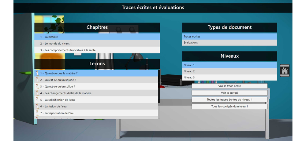 1. Qu’est-ce que la matière ? – 2. Qu’est-ce qu’un liquide ? – 3. Qu’est-ce qu’un solide ? – 4. Les changements d’état de la matière – 5. La solidification de l’eau – 6. La fusion de l’eau – 7. La vaporisation de l’eau – 8. La condensation de l’eau – 9. Le cycle naturel de l’eau – 10. L’air, c’est quoi ? 11. Jouons avec l’air