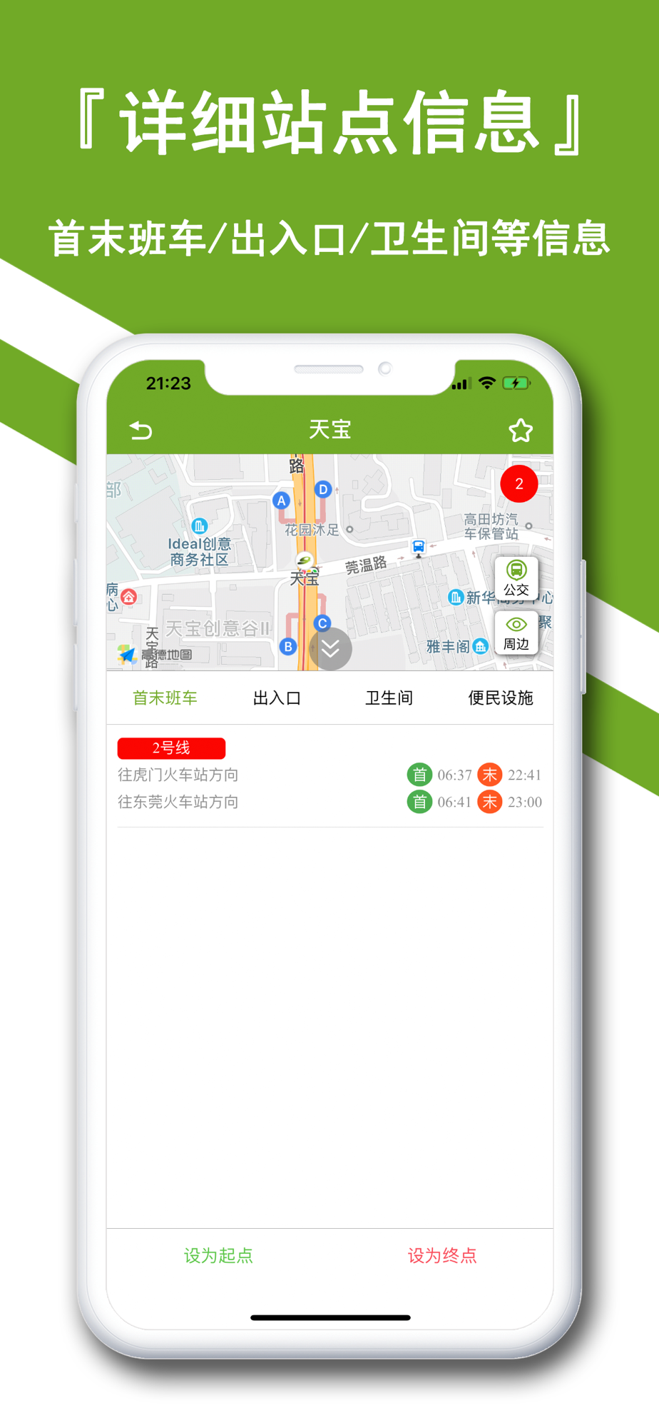 详细站点信息:站点首末班车时间,车站服务设施(卫生间和电梯等)、出入口信息等。