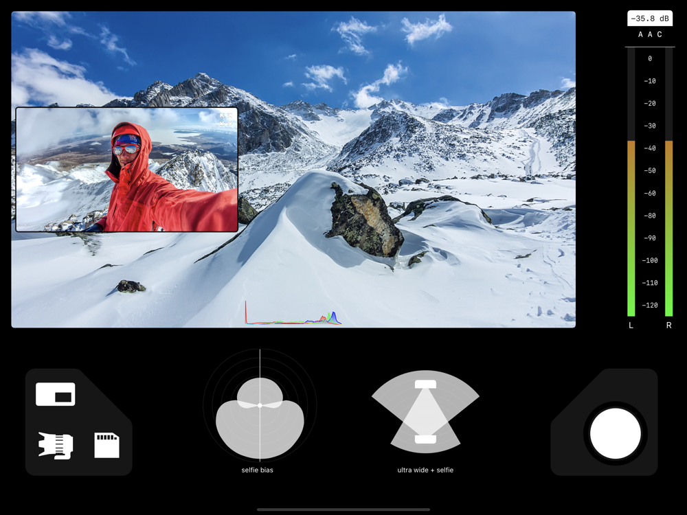 - Camera Visualization: Better than a director’s viewfinder! Use DoubleTake’s camera picker view to visualize all available cameras for your device. Use this view to help decide how to frame your shot and which cameras you will select.