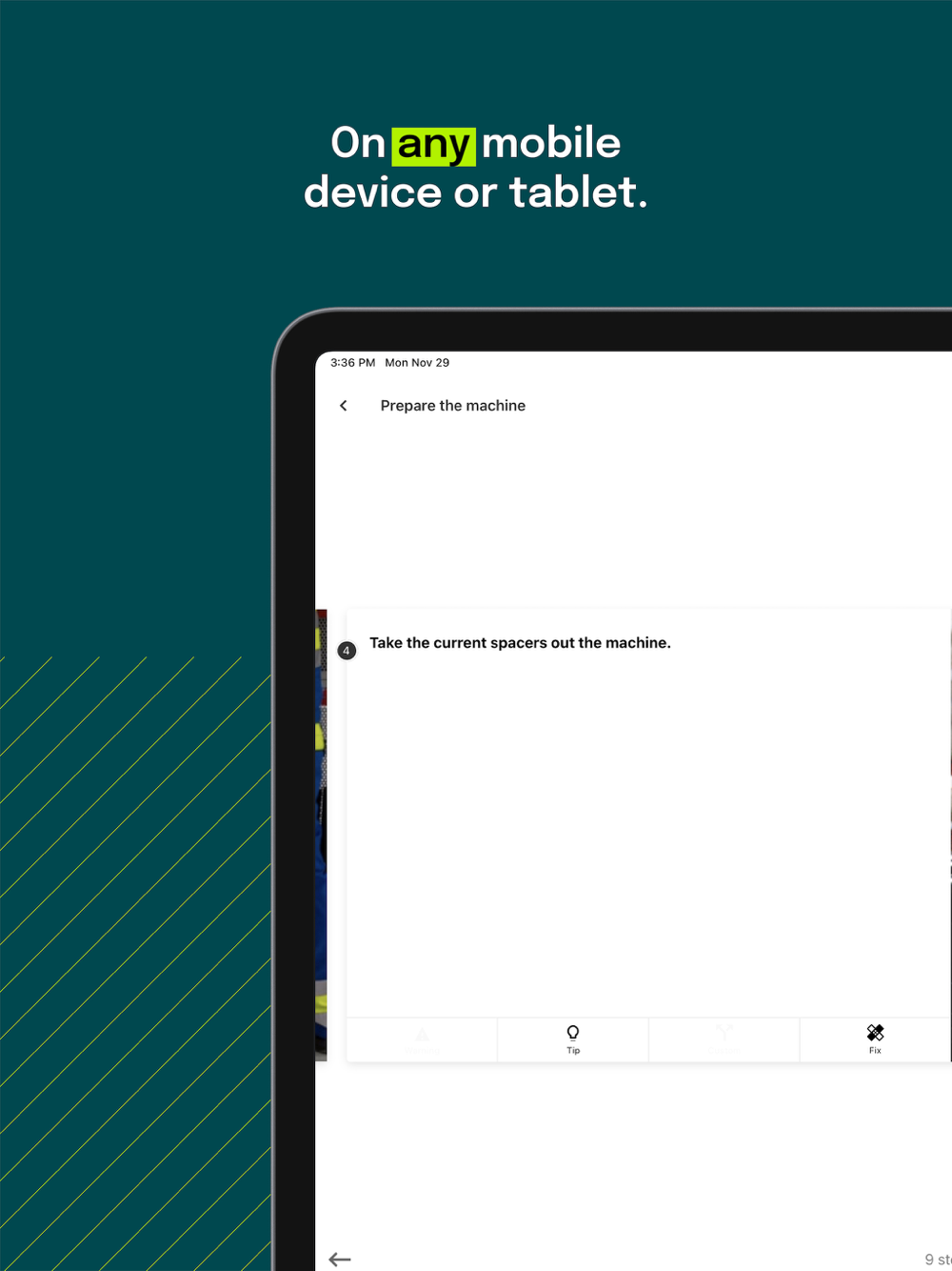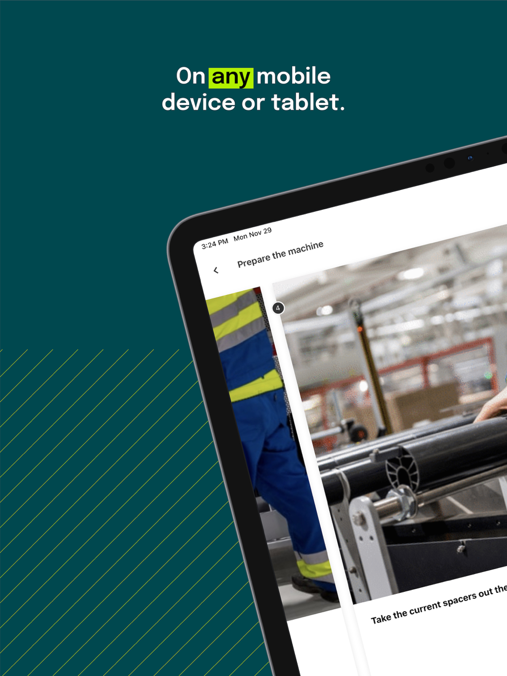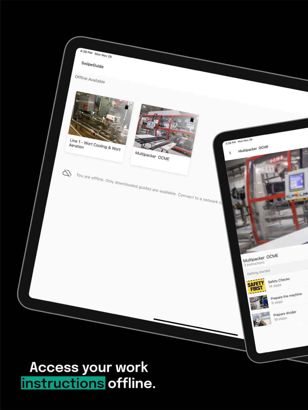 This SwipeGuide app delivers instructions offline to keep you connected to the knowledge you need, when you need it. Before using your instructions in an offline environment, simply connect to wifi and download the work instructions you need to get the job done.