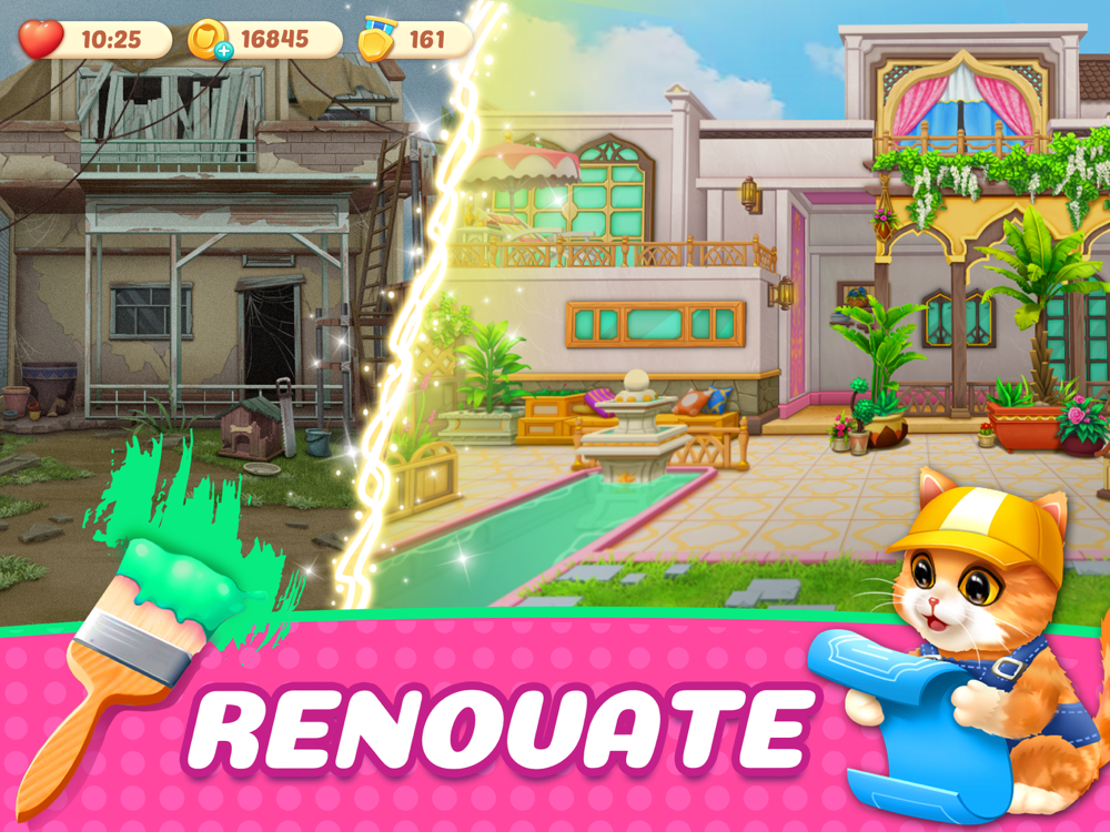 Successful in beating colorful match 3 levels deliver you food, suits for the cats, and materials that you can renovate your mansion. The more chapters you can unlock, the more bond with your sweet kitten! Don’t hesitate, meet your cute kitten pal and start your journey!