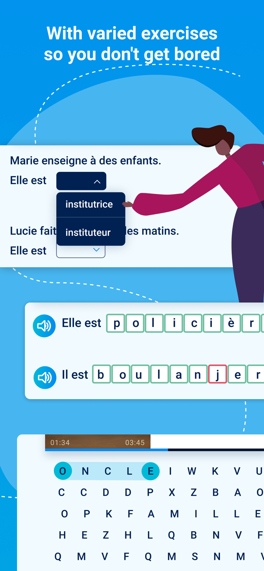 - The exercises are diverse so that you don’t get bored (multiple choice questions, crosswords, fill-in-the-blank texts, etc.),