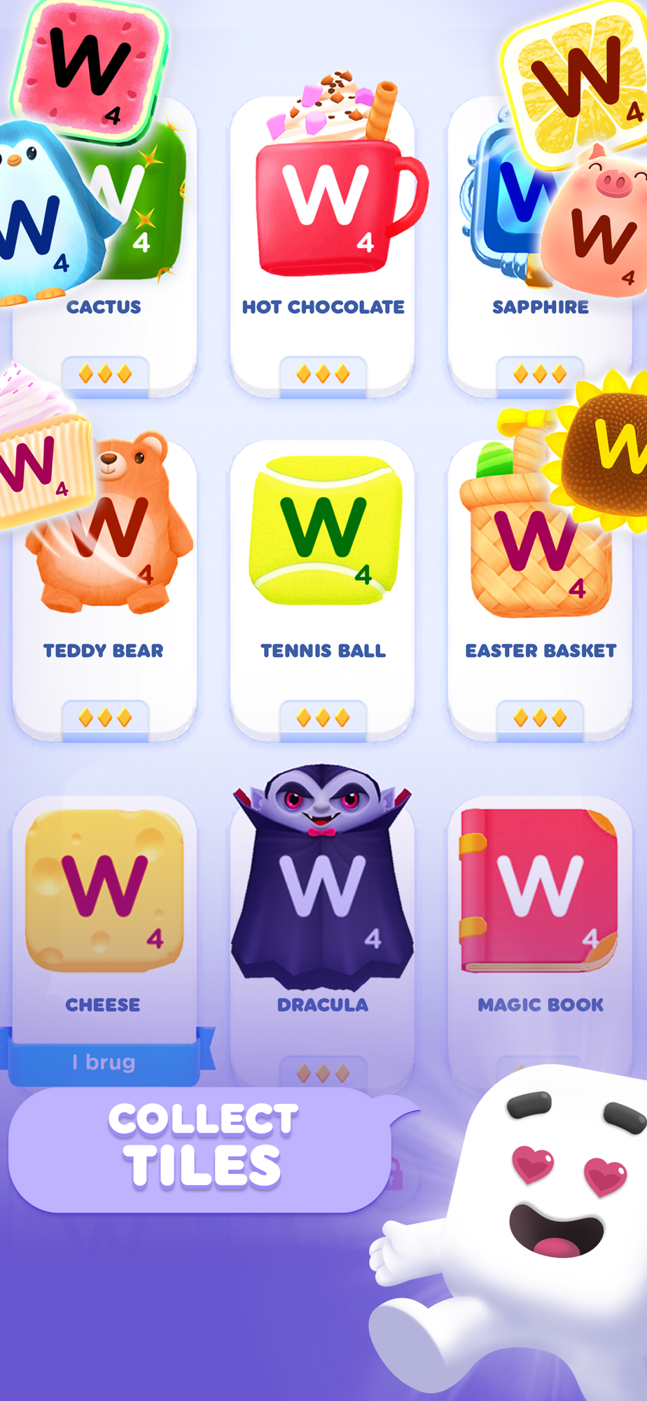 Show off your word game style and skills as you unlock special letter tiles like the cute teddy bear, sushi, or watermelon