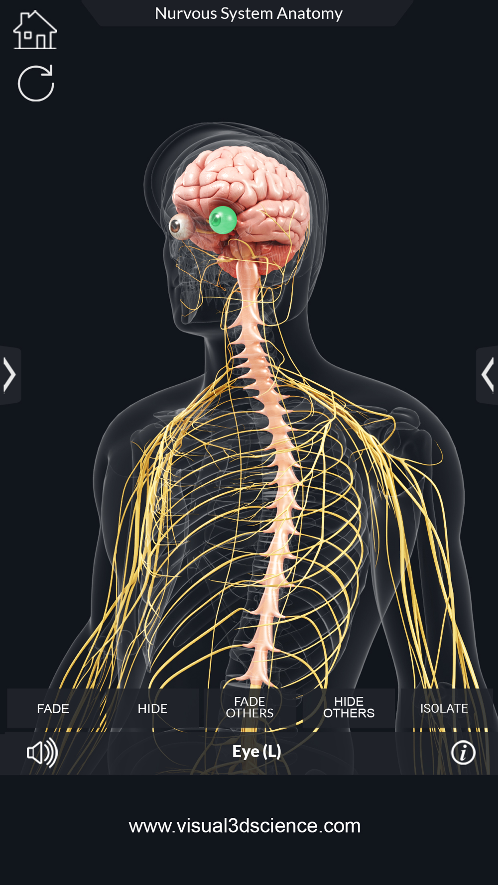 Nervous System Anatomy Pro. app for studying Nervous System Anatomy which allows you to rotate 360° , Zoom and move camera around a highly realistic 3D model.