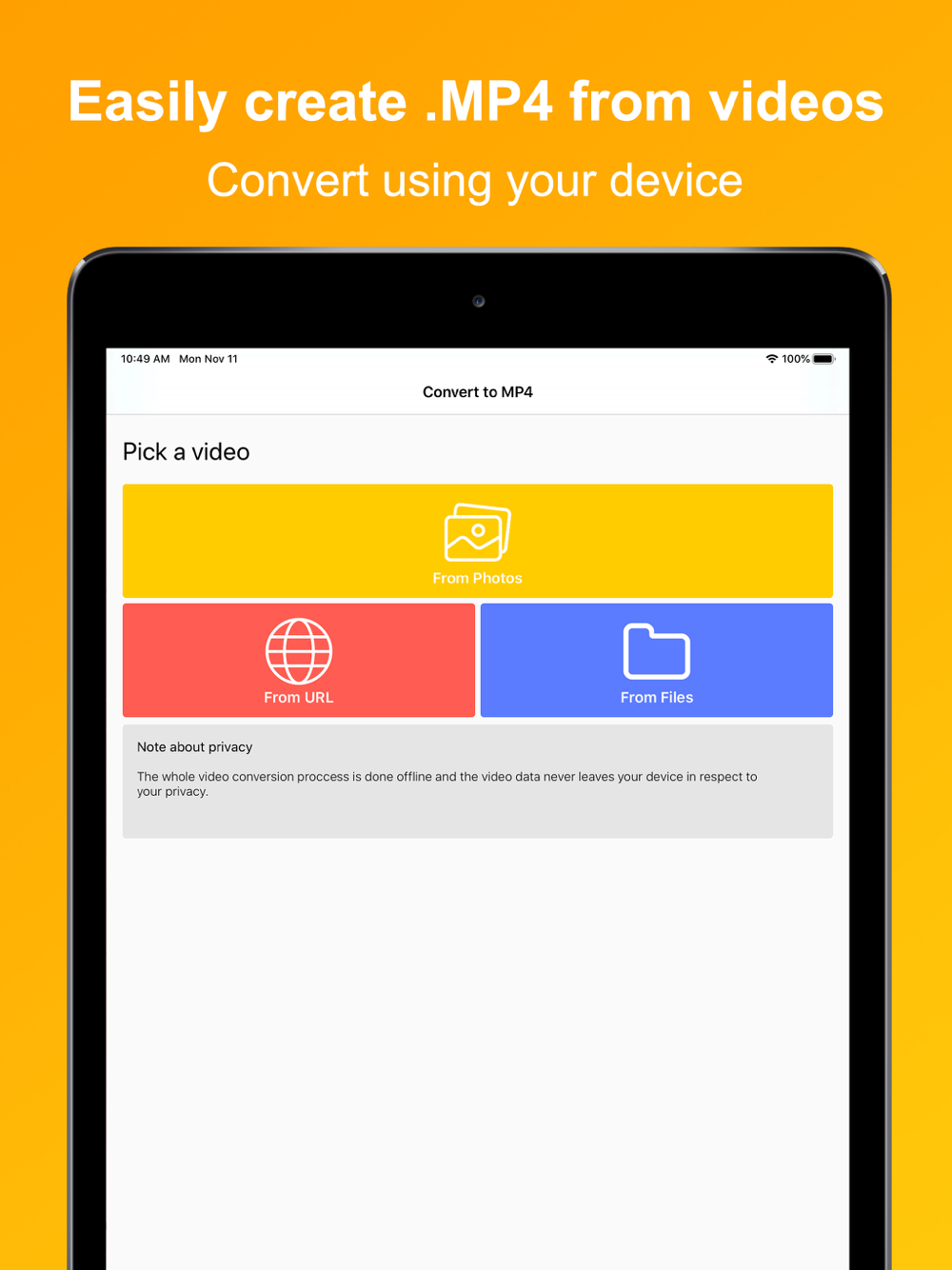 For your privacy MP4 Maker uses the processing power of your mobile device to convert the videos without sending the data to a server, so your files never leave your device.