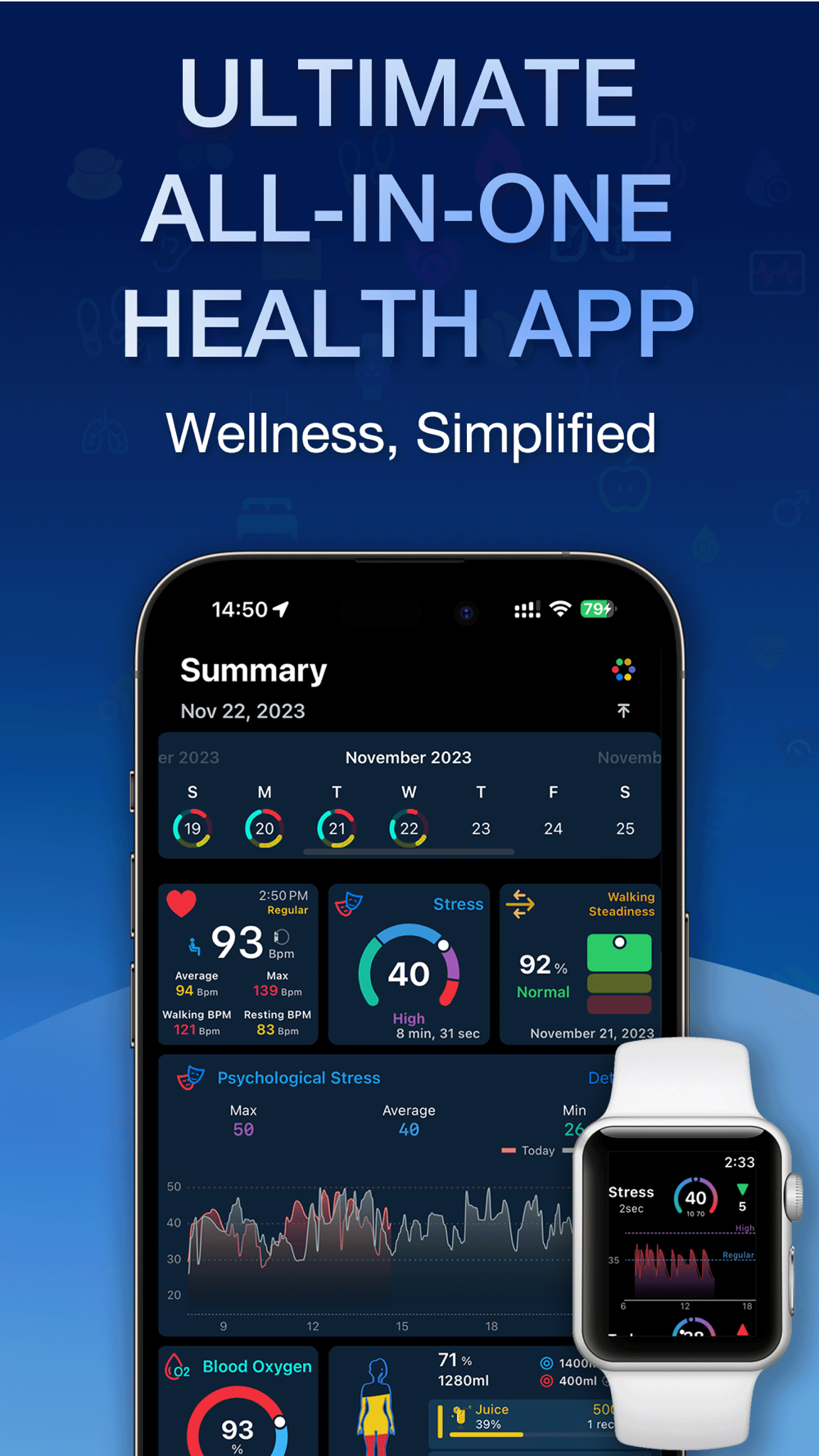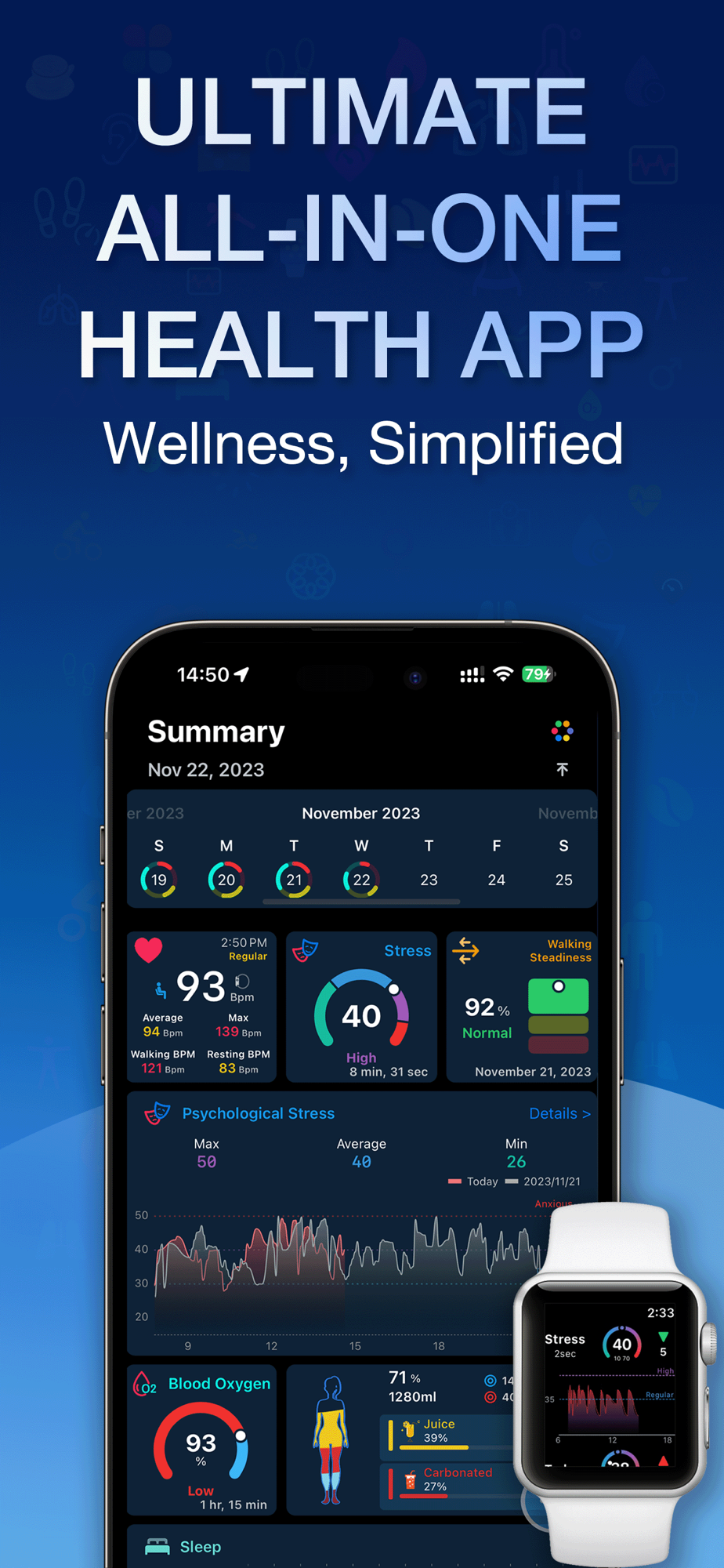 Our app seamlessly integrates with Apple Health, offering intuitive charts that let you focus on what matters most: your overall well-being, heart health, and fitness journey. With real-time analysis of Apple Watch health data, you can monitor various vital signs, track hydration levels, and understand your body's response to daily activities. This isn't just an app; it's your comprehensive health dashboard, always ready to provide insights and guide you towards a healthier lifestyle.