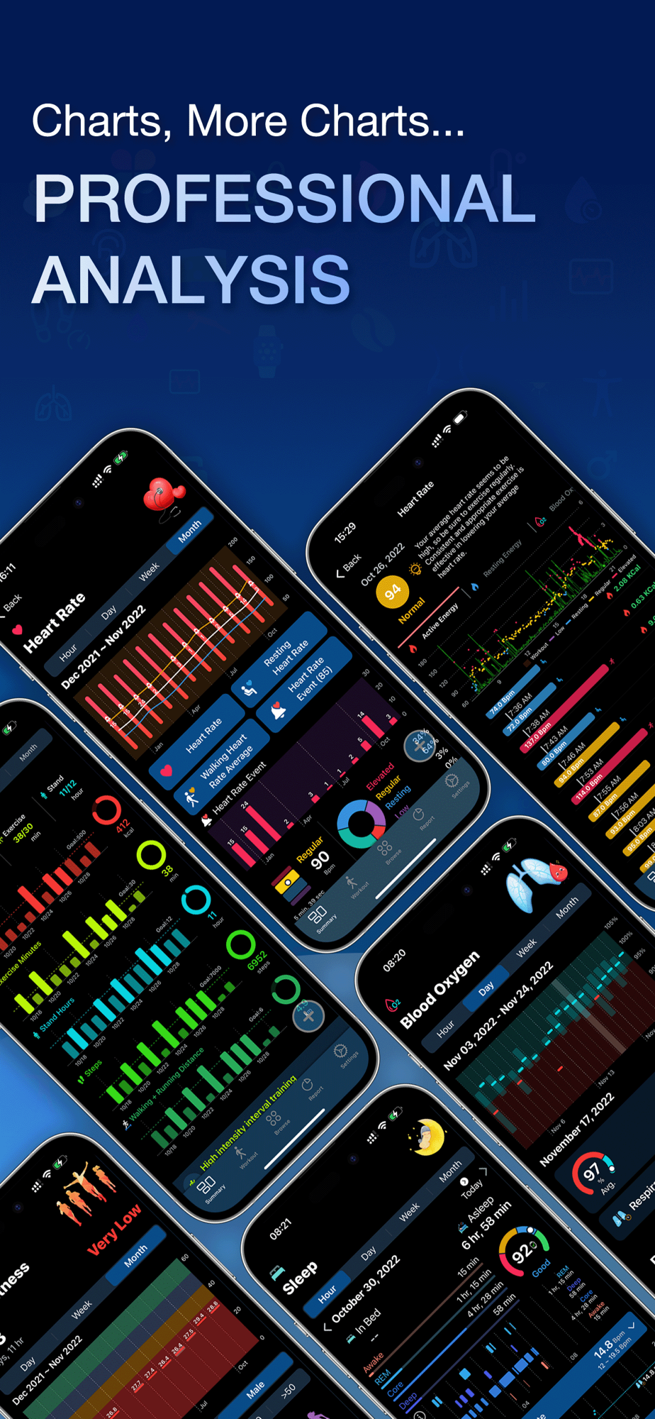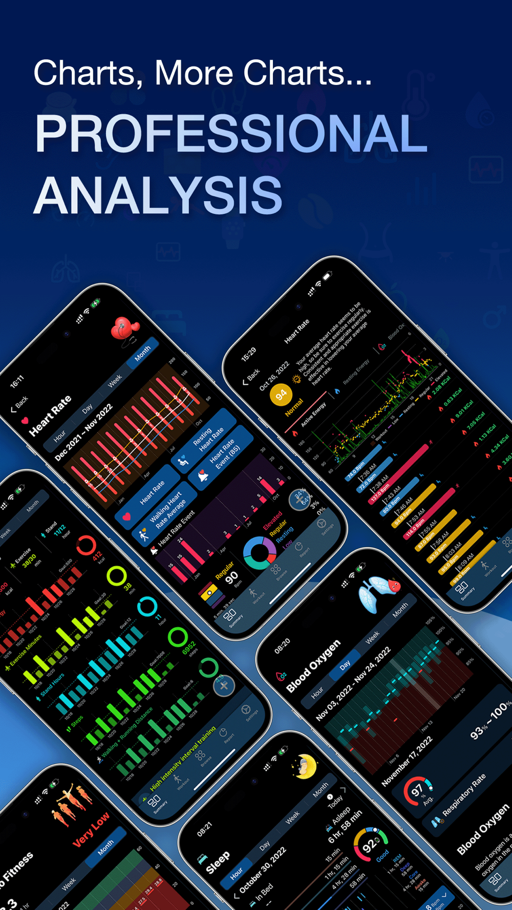 - 40+ body data and 80+ gorgeous charts, such as body temperature, sleep cycle, hrv, blood oxygen, blood pressure, etc.