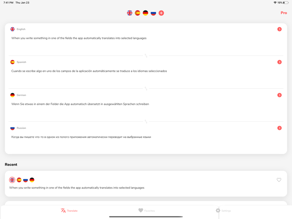 mTranslate allows you to translate into multiple languages at once, just add languages you want and when you write something in one field the app will automatically translate into your selected languages.
