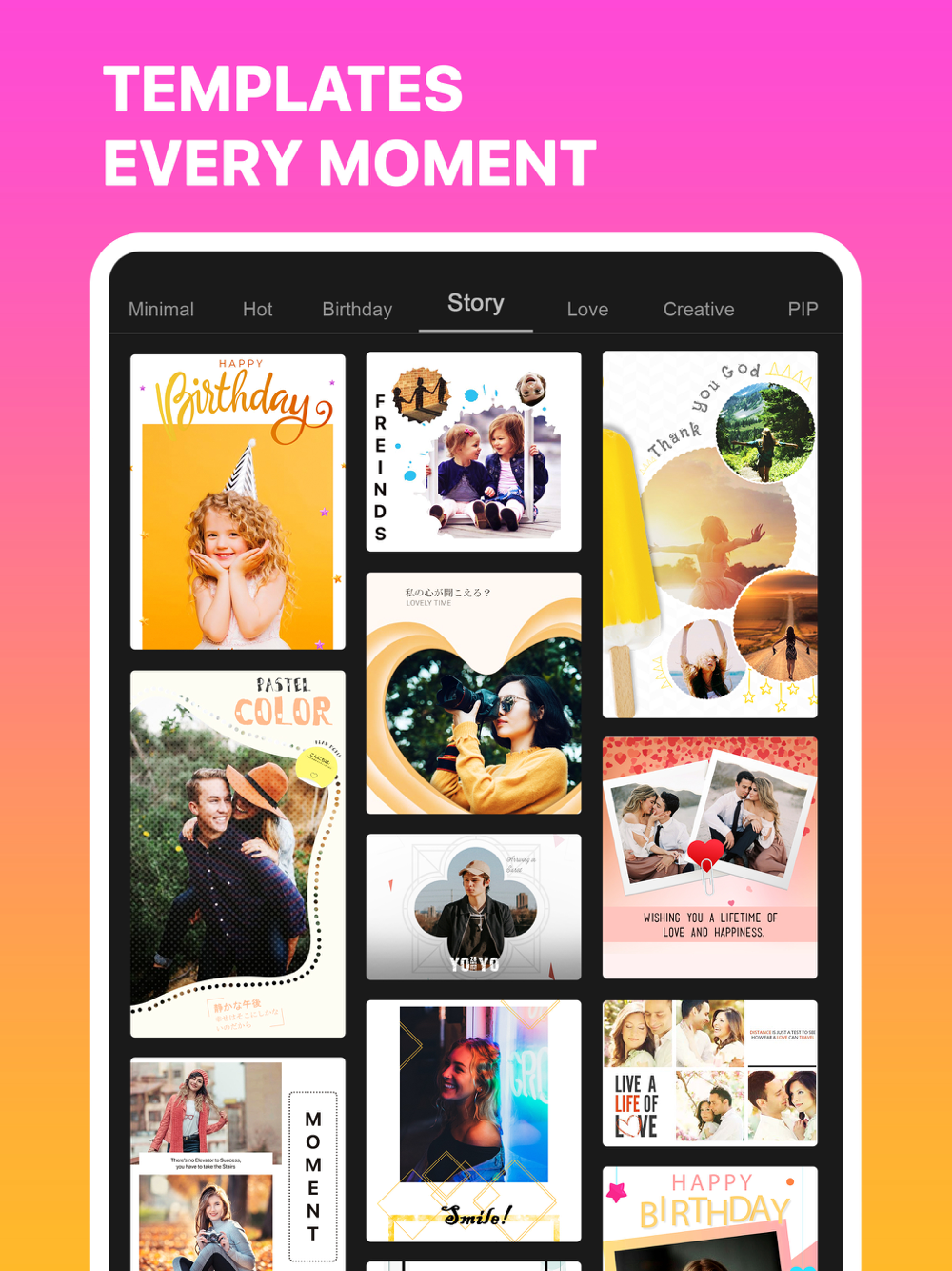 Instant layouts and photo grids to quickly arrange photos from your photo gallery.