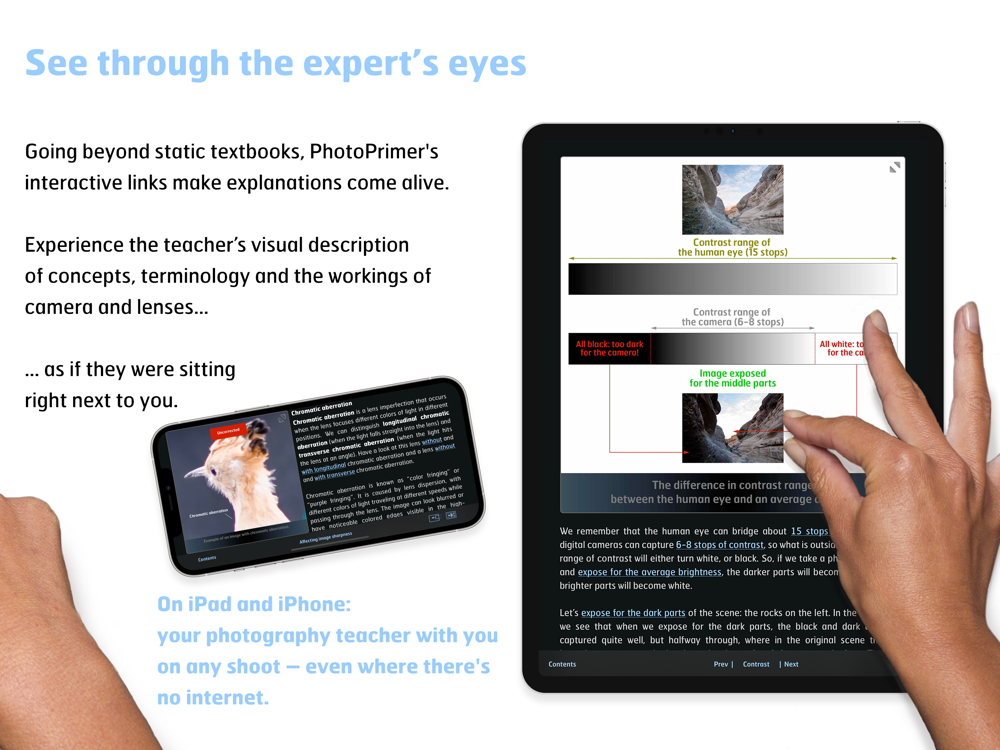 Going beyond static textbooks, PhotoPrimer's interactive links make explanations come alive. Experience the teacher’s visual description of concepts, terminology and the workings of camera and lenses... as if they were sitting right next to you.