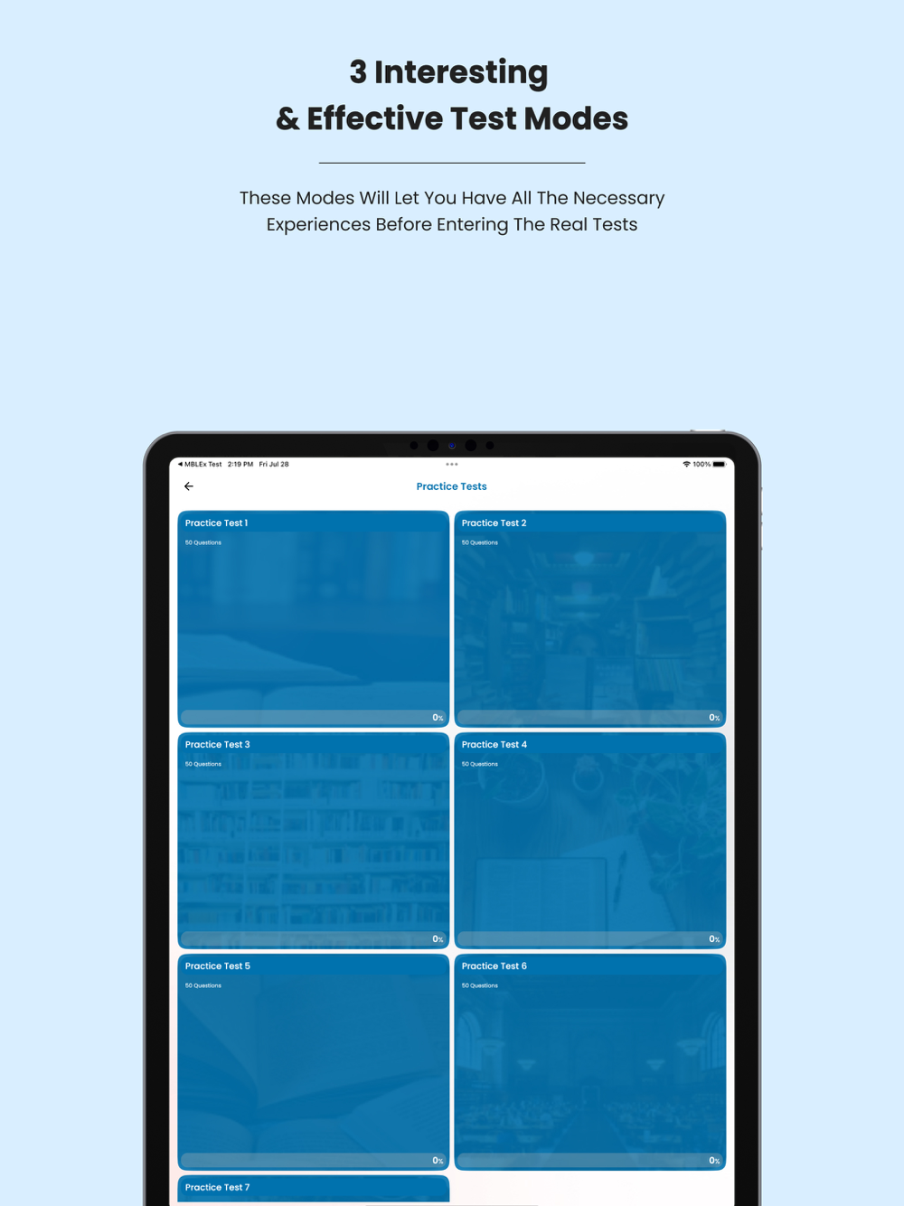 • Mock test: Mock test simulates the real test format. When you finish the test you will see your score and review all the questions.
