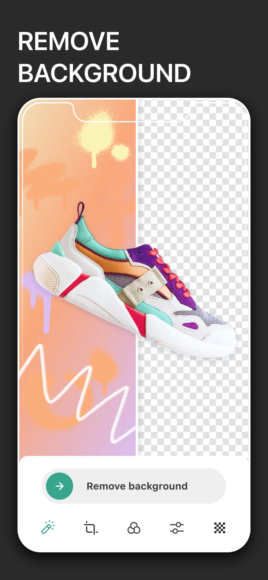 With our advanced Remove Background feature, you can instantly remove the background from any photo in seconds and add your custom background. Add your photo, tap on it, and slide your finger to the right! Match the result with any background of your choice.