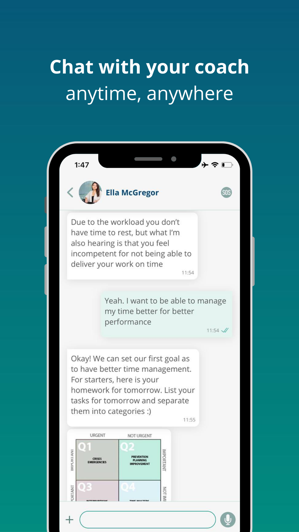 …with your professional anytime, anywhere. Send unlimited texts to them as you’re feeling, thinking, and experiencing it in real-time. Your Professional will check-in with you daily for bite-sized coaching. In general, our Users find having 10-15 mins of daily ThoughtFullChats helpful!