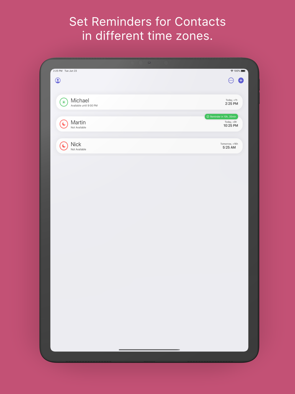 With Snoozie, you can personalize time zones for your contacts. Know exactly what time it is on their end and set a reminder if you like to catch up before their day comes to an end.