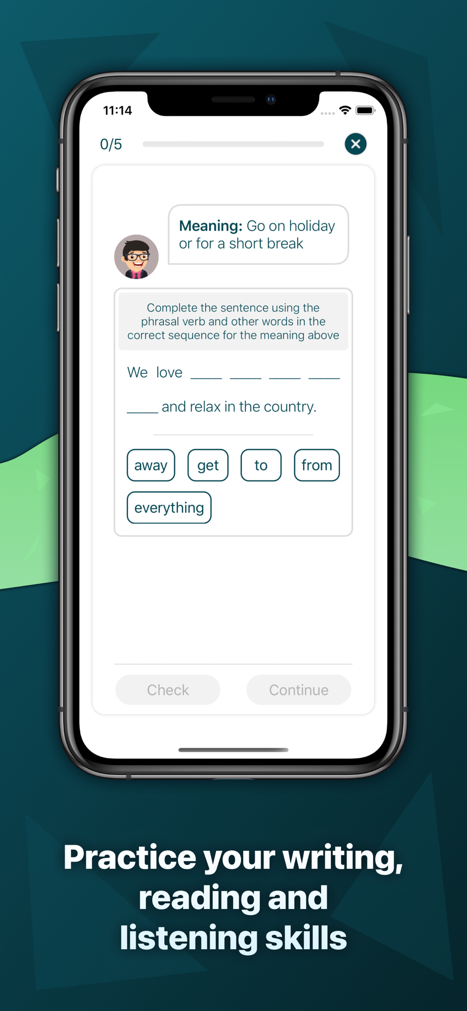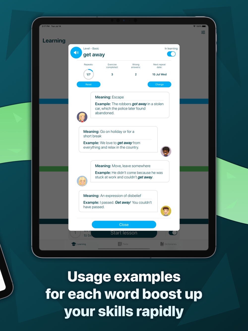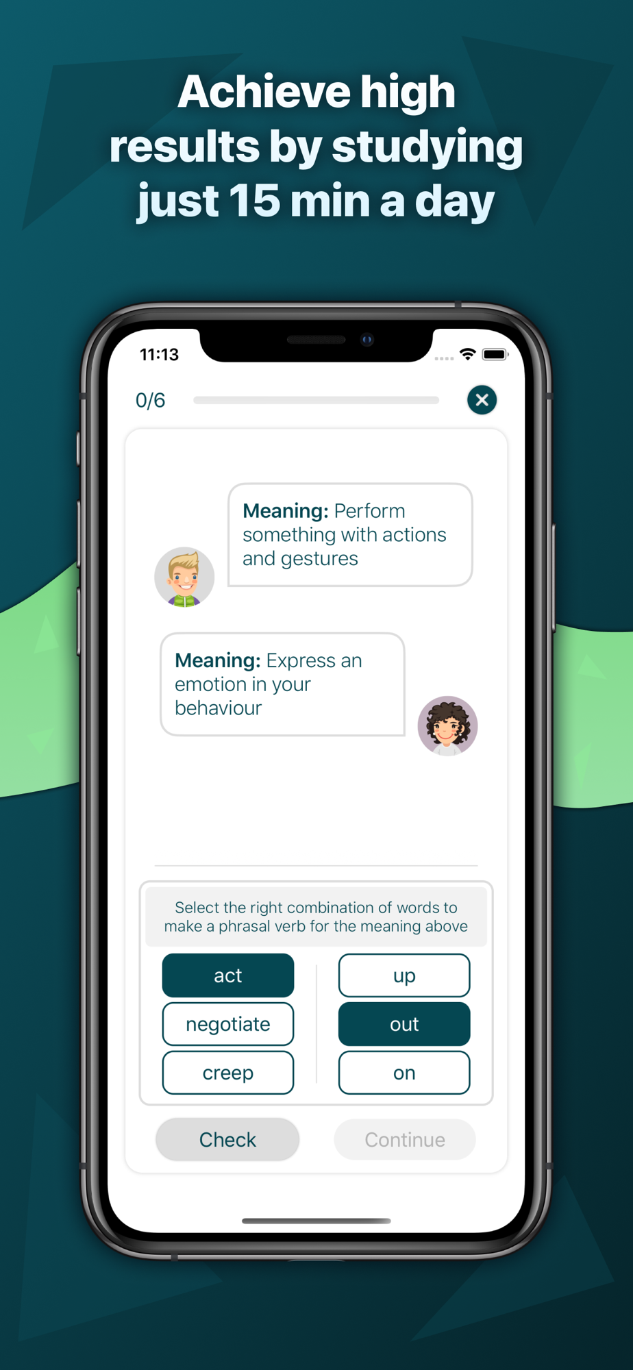 The learning technique, applied in the app, allows you to quick learn English phrasal verbs (up to 900 new phrasal verbs phrases per month), which are often use in common English native speech. It will give huge support to improve your English communication skills.