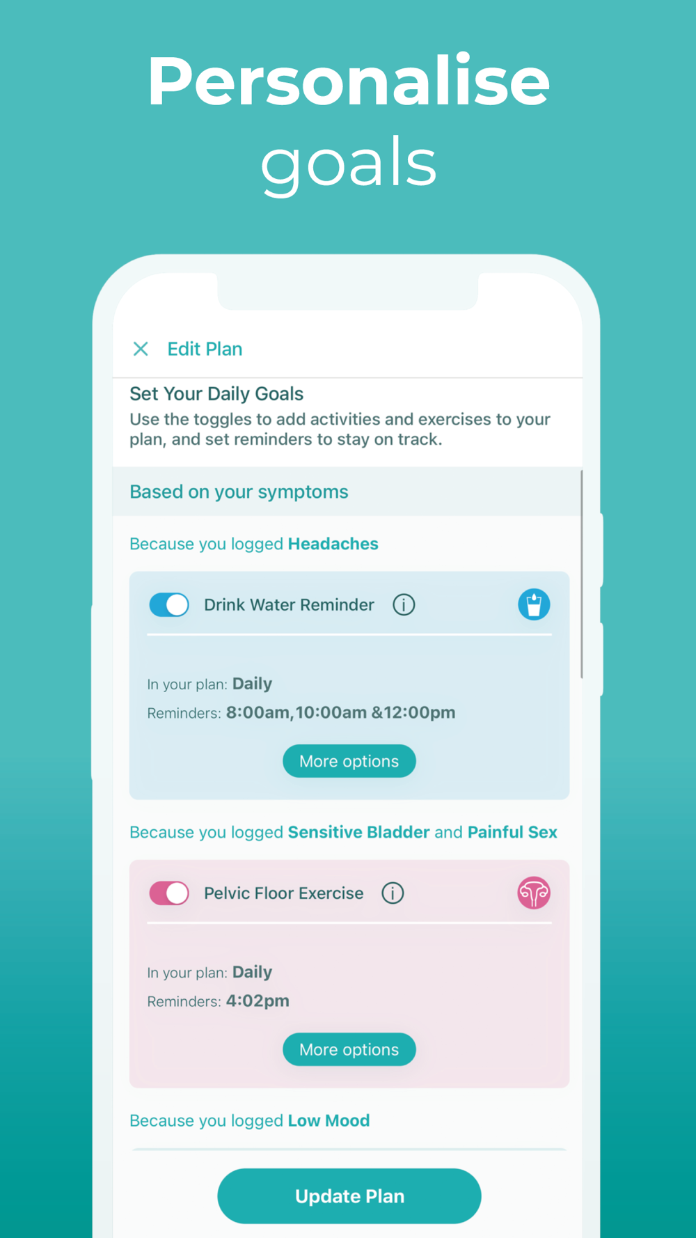 - Symptom toolkit includes: interactive CBT exercises, sleep meditation, muscle relaxation, pelvic floor training, deep breathing, and more.