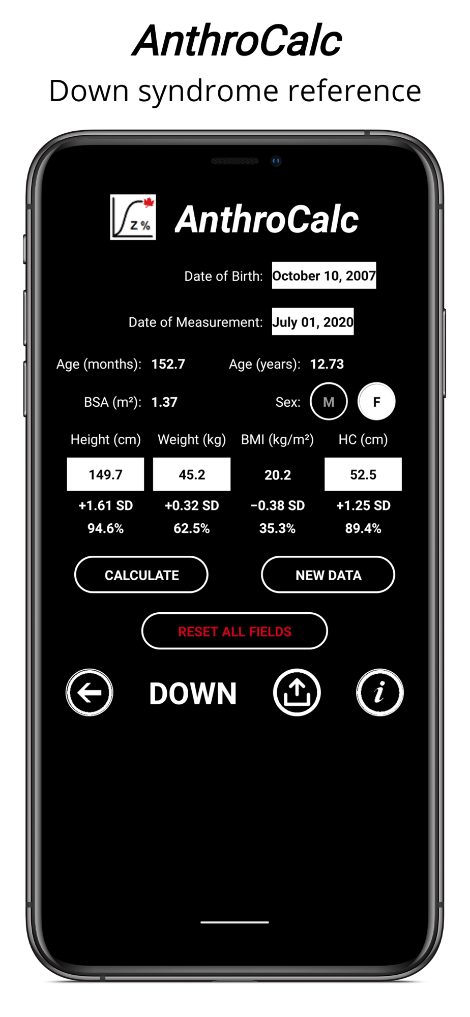 The AnthroCalc app calculates percentiles and Z-scores for length/height, weight, weight-for-length/height, body-mass index, and head circumference for typically growing children (using WHO or CDC references); for children with a number of syndromes (Turner, Down, Prader–Willi, Russell–Silver and Noonan); and for preterm infants (using Fenton, INTERGROWTH-21st, or Olsen references). The app also performs specialized calculations of blood pressure (using NIH 2004 or AAP 2017 references), extended obesity measures, waist circumference, arm circumference, triceps and subscapular skinfolds, target (midparental) height, predicted adult height, and height velocity for healthy children. Citations are provided for each reference range used for the calculations.