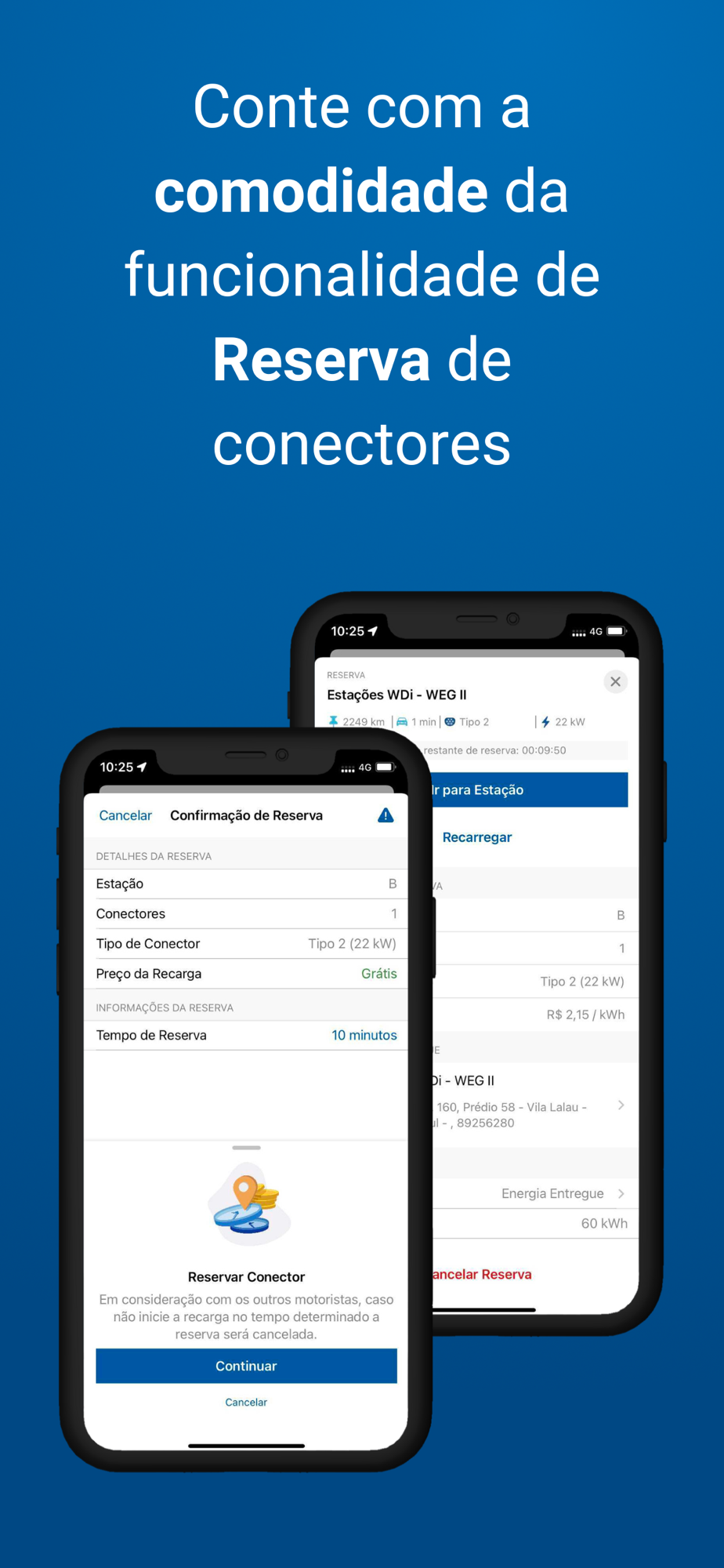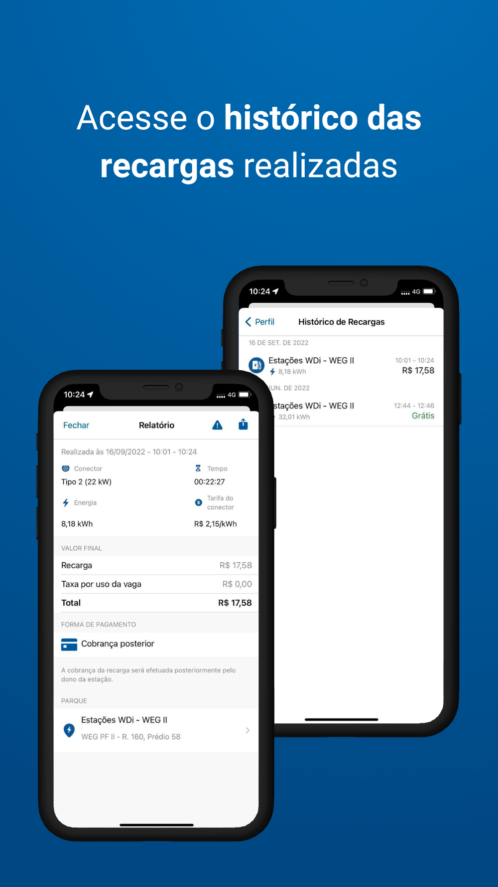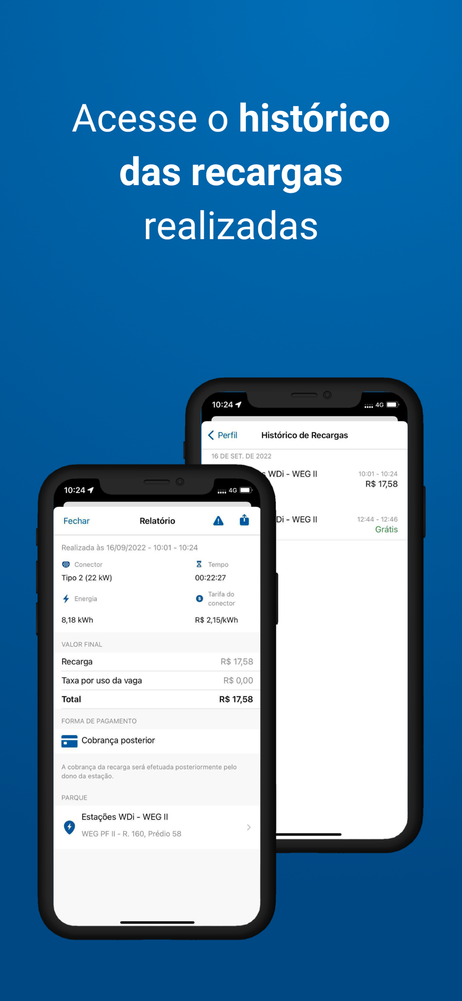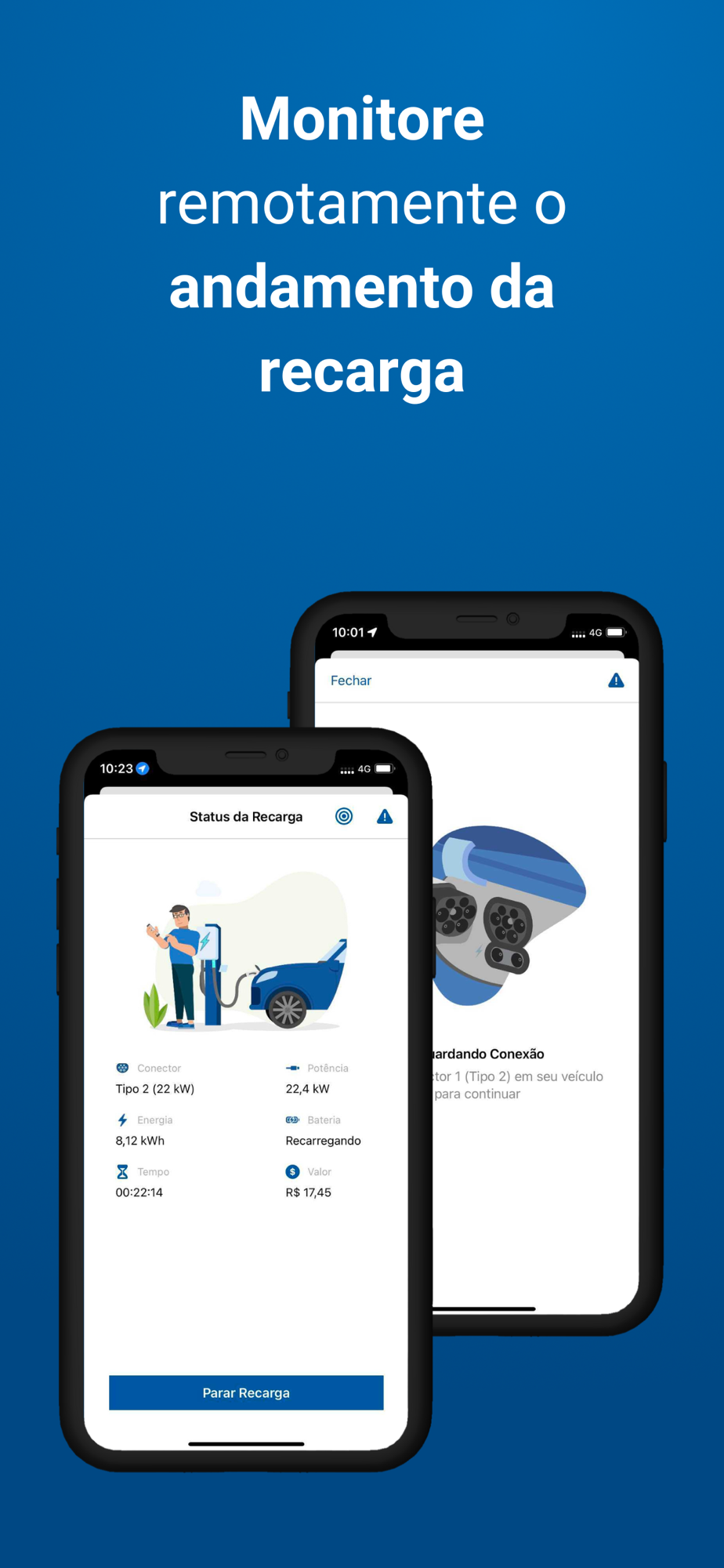 Controle total sobre sua recarga: inicie, visualize o andamento em tempo real e interrompa a recarga pelo aplicativo.