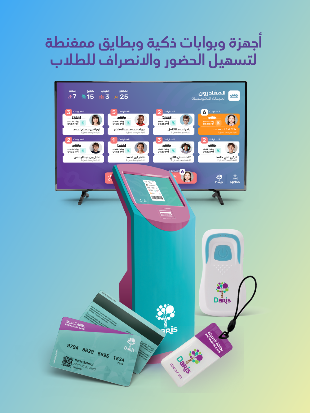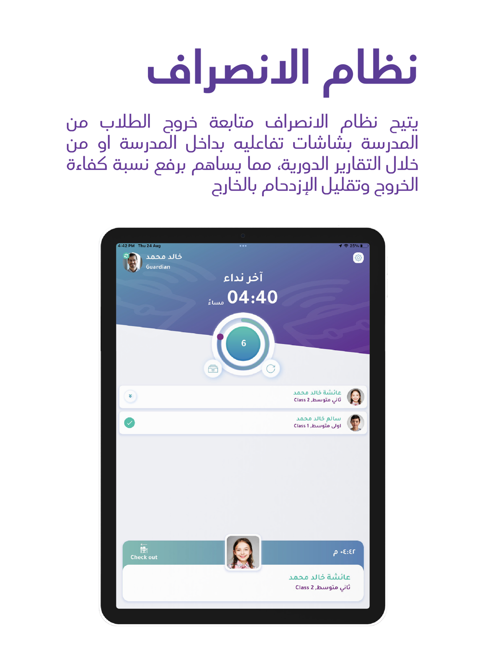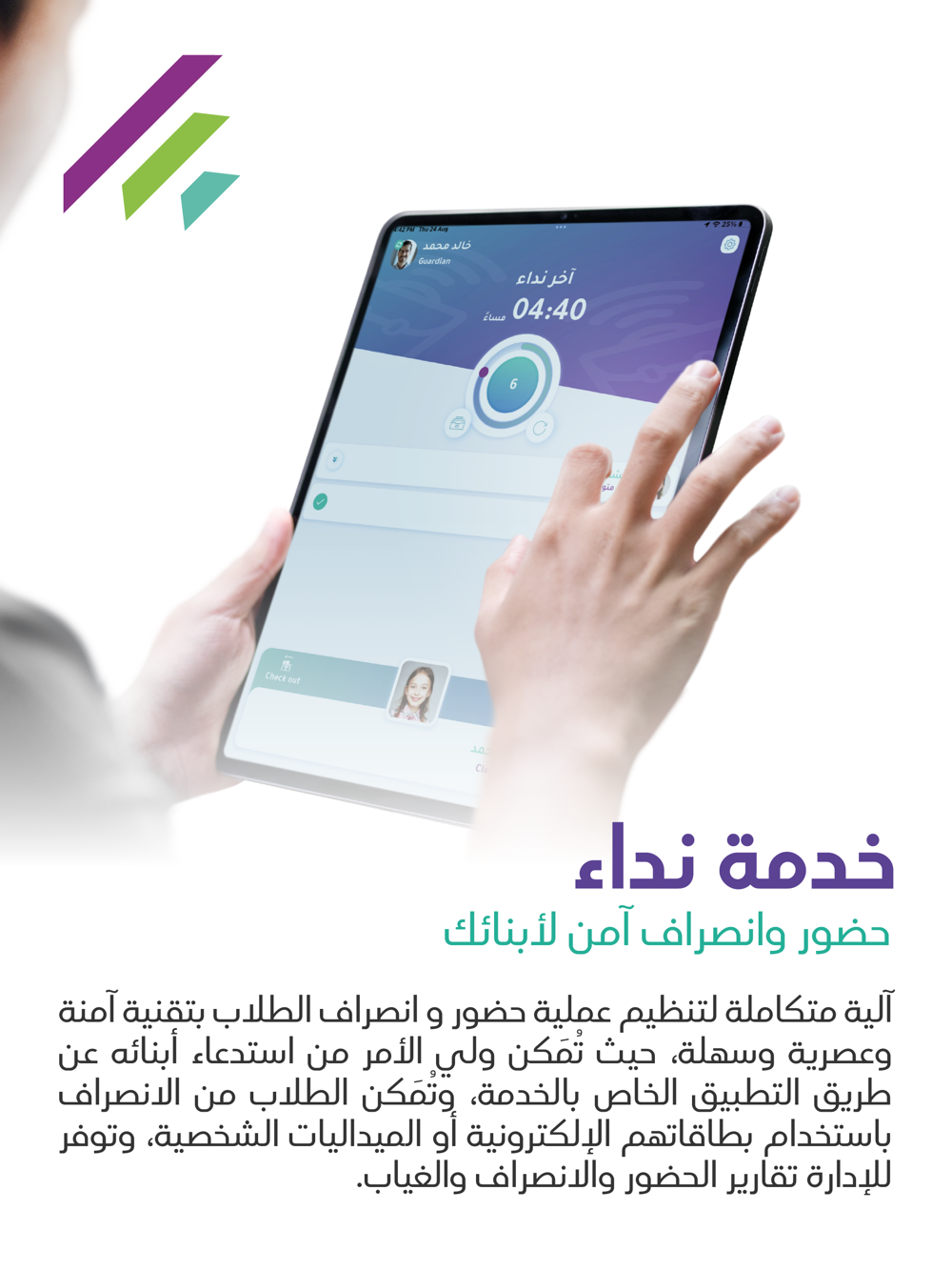 آلية متكاملة لتنظيم عملية حضور و انصراف الطلاب بتقنية آمنة وعصرية وسهلة، حيث تُمَكن ولي الأمر من استدعاء أبنائه عن طريق التطبيق الخاص بالخدمة، وتُمَكن الطلاب من الانصراف باستخدام بطاقاتهم الإلكترونية أو الميداليات الشخصية، وتوفر للإدارة تقارير الحضور والانصراف والغياب.